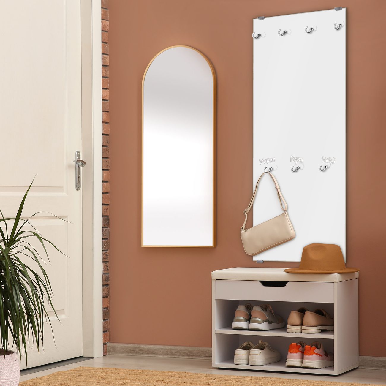 FUNKTION: Die banjado Wandgarderobe mit Farbe weiß ist Ihr täglicher Begleiter. Zuverlässig hängen hier Ihre Jacken und Mäntel griffbereit. Das Echtglas ist Ihr Paneel auch beschreibbar und wieder abwischbar. DESIGN: Sie erhalten eine Garderobenleiste aus elegantem Echtglas mit dem Farbbrillanten Farbe weiß hinterklebt. Das Design ist zeitlos klassisch, ohne dabei auf Funktionalität zu verzichten. Suchen Sie aus einer Vielzahl von Farbeen das für Ihre Einrichtung Passende aus. DETAILS: Die Flurgarderobe besteht aus 4mm gehärtetem Sicherheitsglas. Sie ist 50cm breit, 125cm hoch und 6cm tief. Die Garderobenhaken zur Selbstmontage präsentieren sich in Edelstahl-Optik, ebenso die Abstandshalter für die Wandmontage. Ihre neue Garderobe ist sofort einsatzbereit. NUTZEN: Ihre neue Garderobe hält nicht nur zuverlässig Ihre Kleidung, sie ist auch optisch ein Blickfang. Durch das Glas können Sie an der Garderobe mit wasserlöslichen Kreidestiften oder Whiteboard-Markern auch Nachrichten hinterlassen. BANJADO: Wir sind ein kleines kreatives Team aus Sachsen und entwickeln Produkte die Design und Funktionalität verbinden sollen. Viel Freude mit Ihrer neuen Garderobe wünscht das banjado-Team!