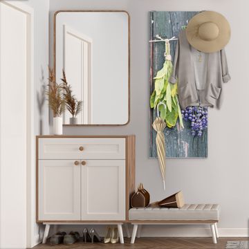 FUNKTION: Die banjado Wandgarderobe mit Motiv Acht Kräuter ist Ihr täglicher Begleiter. Zuverlässig hängen hier Ihre Jacken und Mäntel griffbereit. Das Echtglas ist Ihr Paneel auch beschreibbar und wieder abwischbar. DESIGN: Sie erhalten eine Garderobenleiste aus elegantem Echtglas mit dem Farbbrillanten Motiv Acht Kräuter hinterklebt. Das Design ist zeitlos klassisch, ohne dabei auf Funktionalität zu verzichten. Suchen Sie aus einer Vielzahl von Motiven das für Ihre Einrichtung Passende aus. DETAILS: Die Flurgarderobe besteht aus 4mm gehärtetem Sicherheitsglas. Sie ist 50cm breit, 125cm hoch und 6cm tief. Die Garderobenhaken zur Selbstmontage präsentieren sich in Edelstahl-Optik, ebenso die Abstandshalter für die Wandmontage. Ihre neue Garderobe ist sofort einsatzbereit. NUTZEN: Ihre neue Garderobe hält nicht nur zuverlässig Ihre Kleidung, sie ist auch optisch ein Blickfang. Durch das Glas können Sie an der Garderobe mit wasserlöslichen Kreidestiften oder Whiteboard-Markern auch Nachrichten hinterlassen. BANJADO: Wir sind ein kleines kreatives Team aus Sachsen und entwickeln Produkte die Design und Funktionalität verbinden sollen. Viel Freude mit Ihrer neuen Garderobe wünscht das banjado-Team!