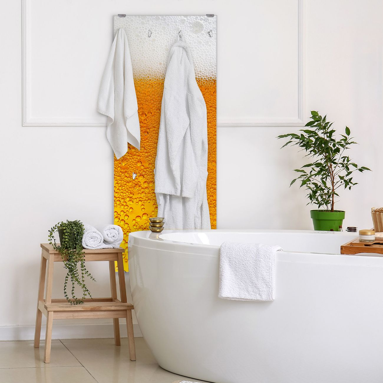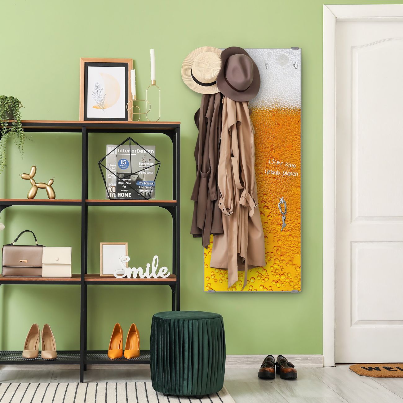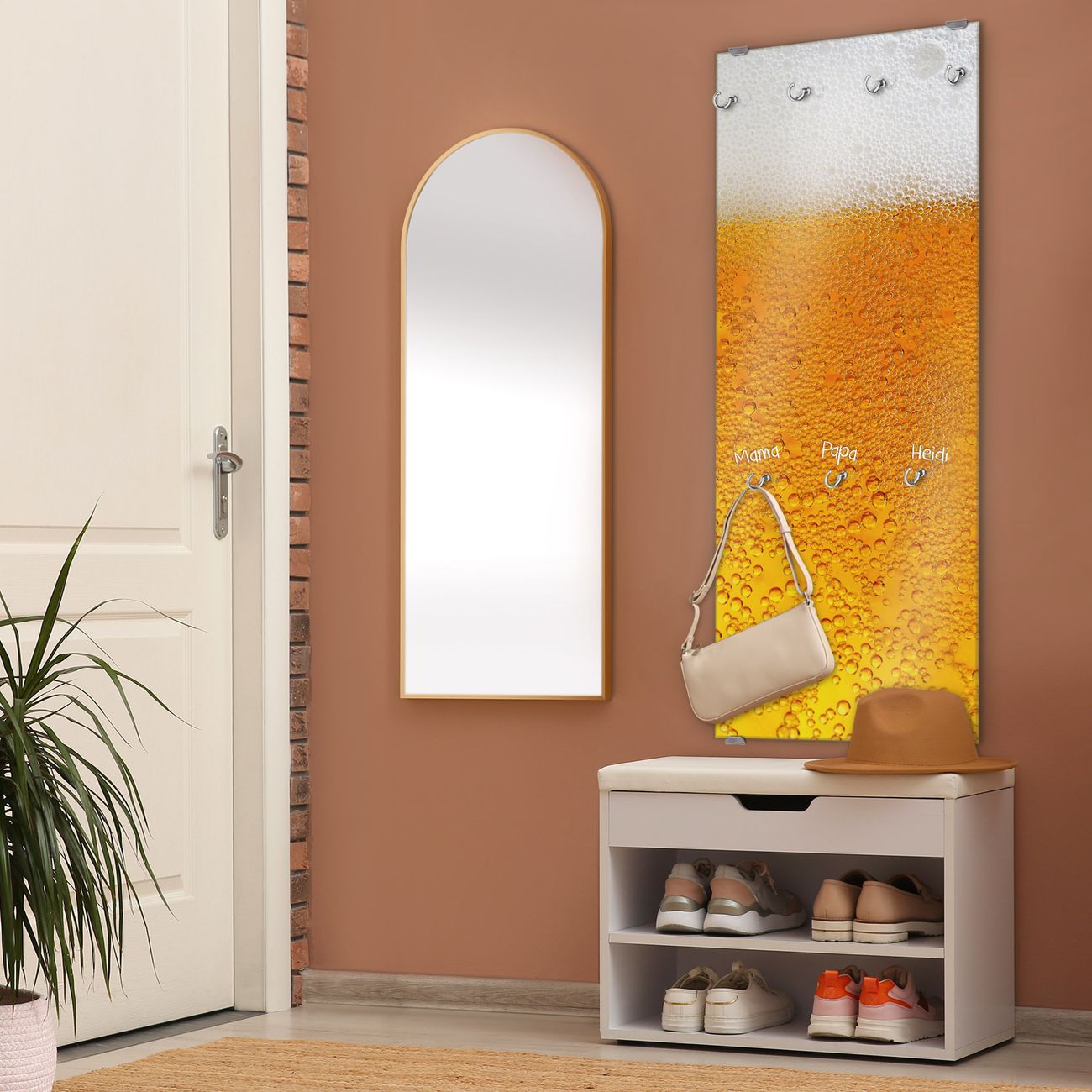 FUNKTION: Die banjado Wandgarderobe mit Motiv Bier ist Ihr täglicher Begleiter. Zuverlässig hängen hier Ihre Jacken und Mäntel griffbereit. Das Echtglas ist Ihr Paneel auch beschreibbar und wieder abwischbar. DESIGN: Sie erhalten eine Garderobenleiste aus elegantem Echtglas mit dem Farbbrillanten Motiv Bier hinterklebt. Das Design ist zeitlos klassisch, ohne dabei auf Funktionalität zu verzichten. Suchen Sie aus einer Vielzahl von Motiven das für Ihre Einrichtung Passende aus. DETAILS: Die Flurgarderobe besteht aus 4mm gehärtetem Sicherheitsglas. Sie ist 50cm breit, 125cm hoch und 6cm tief. Die Garderobenhaken zur Selbstmontage präsentieren sich in Edelstahl-Optik, ebenso die Abstandshalter für die Wandmontage. Ihre neue Garderobe ist sofort einsatzbereit. NUTZEN: Ihre neue Garderobe hält nicht nur zuverlässig Ihre Kleidung, sie ist auch optisch ein Blickfang. Durch das Glas können Sie an der Garderobe mit wasserlöslichen Kreidestiften oder Whiteboard-Markern auch Nachrichten hinterlassen. BANJADO: Wir sind ein kleines kreatives Team aus Sachsen und entwickeln Produkte die Design und Funktionalität verbinden sollen. Viel Freude mit Ihrer neuen Garderobe wünscht das banjado-Team!