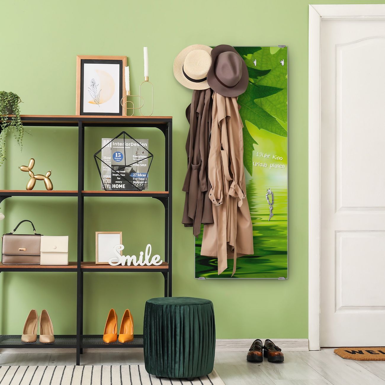 FUNKTION: Die banjado Wandgarderobe mit Motiv Blättertraum ist Ihr täglicher Begleiter. Zuverlässig hängen hier Ihre Jacken und Mäntel griffbereit. Das Echtglas ist Ihr Paneel auch beschreibbar und wieder abwischbar. DESIGN: Sie erhalten eine Garderobenleiste aus elegantem Echtglas mit dem Farbbrillanten Motiv Blättertraum hinterklebt. Das Design ist zeitlos klassisch, ohne dabei auf Funktionalität zu verzichten. Suchen Sie aus einer Vielzahl von Motiven das für Ihre Einrichtung Passende aus. DETAILS: Die Flurgarderobe besteht aus 4mm gehärtetem Sicherheitsglas. Sie ist 50cm breit, 125cm hoch und 6cm tief. Die Garderobenhaken zur Selbstmontage präsentieren sich in Edelstahl-Optik, ebenso die Abstandshalter für die Wandmontage. Ihre neue Garderobe ist sofort einsatzbereit. NUTZEN: Ihre neue Garderobe hält nicht nur zuverlässig Ihre Kleidung, sie ist auch optisch ein Blickfang. Durch das Glas können Sie an der Garderobe mit wasserlöslichen Kreidestiften oder Whiteboard-Markern auch Nachrichten hinterlassen. BANJADO: Wir sind ein kleines kreatives Team aus Sachsen und entwickeln Produkte die Design und Funktionalität verbinden sollen. Viel Freude mit Ihrer neuen Garderobe wünscht das banjado-Team!
