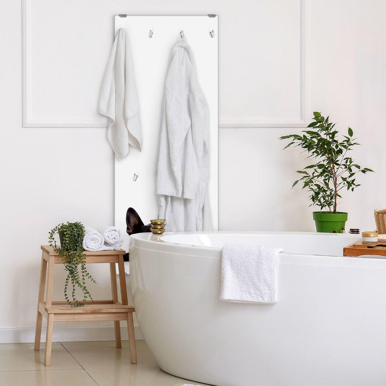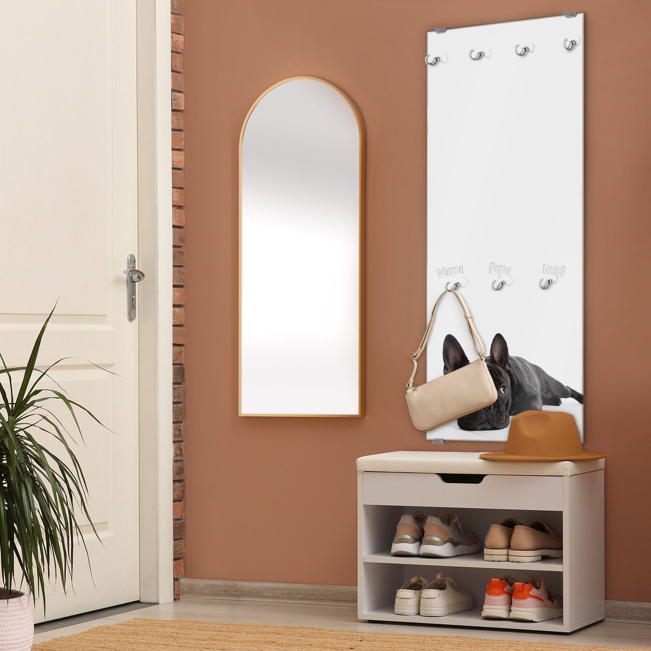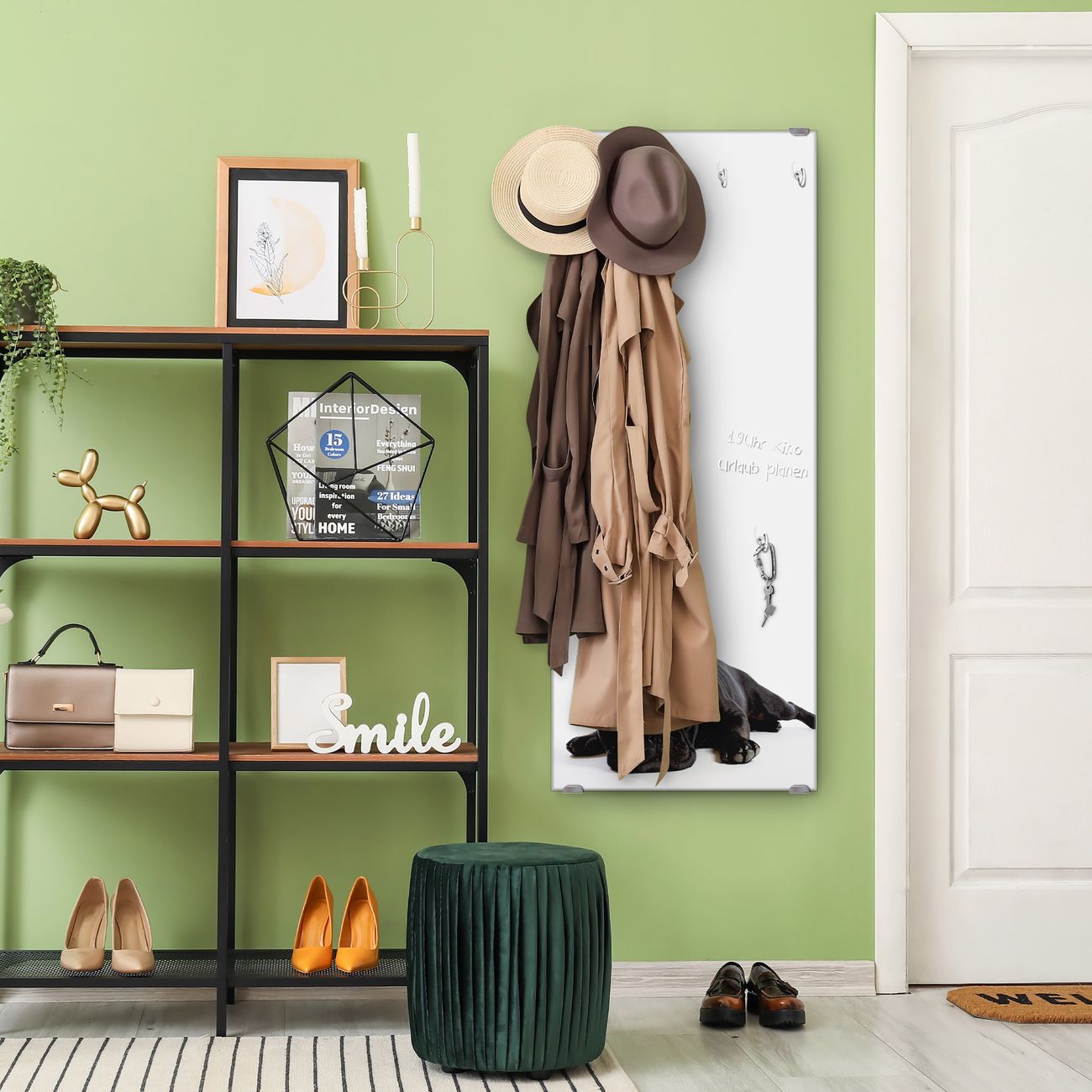 FUNKTION: Die banjado Wandgarderobe mit Motiv Bulldogge ist Ihr täglicher Begleiter. Zuverlässig hängen hier Ihre Jacken und Mäntel griffbereit. Das Echtglas ist Ihr Paneel auch beschreibbar und wieder abwischbar. DESIGN: Sie erhalten eine Garderobenleiste aus elegantem Echtglas mit dem Farbbrillanten Motiv Bulldogge hinterklebt. Das Design ist zeitlos klassisch, ohne dabei auf Funktionalität zu verzichten. Suchen Sie aus einer Vielzahl von Motiven das für Ihre Einrichtung Passende aus. DETAILS: Die Flurgarderobe besteht aus 4mm gehärtetem Sicherheitsglas. Sie ist 50cm breit, 125cm hoch und 6cm tief. Die Garderobenhaken zur Selbstmontage präsentieren sich in Edelstahl-Optik, ebenso die Abstandshalter für die Wandmontage. Ihre neue Garderobe ist sofort einsatzbereit. NUTZEN: Ihre neue Garderobe hält nicht nur zuverlässig Ihre Kleidung, sie ist auch optisch ein Blickfang. Durch das Glas können Sie an der Garderobe mit wasserlöslichen Kreidestiften oder Whiteboard-Markern auch Nachrichten hinterlassen. BANJADO: Wir sind ein kleines kreatives Team aus Sachsen und entwickeln Produkte die Design und Funktionalität verbinden sollen. Viel Freude mit Ihrer neuen Garderobe wünscht das banjado-Team!