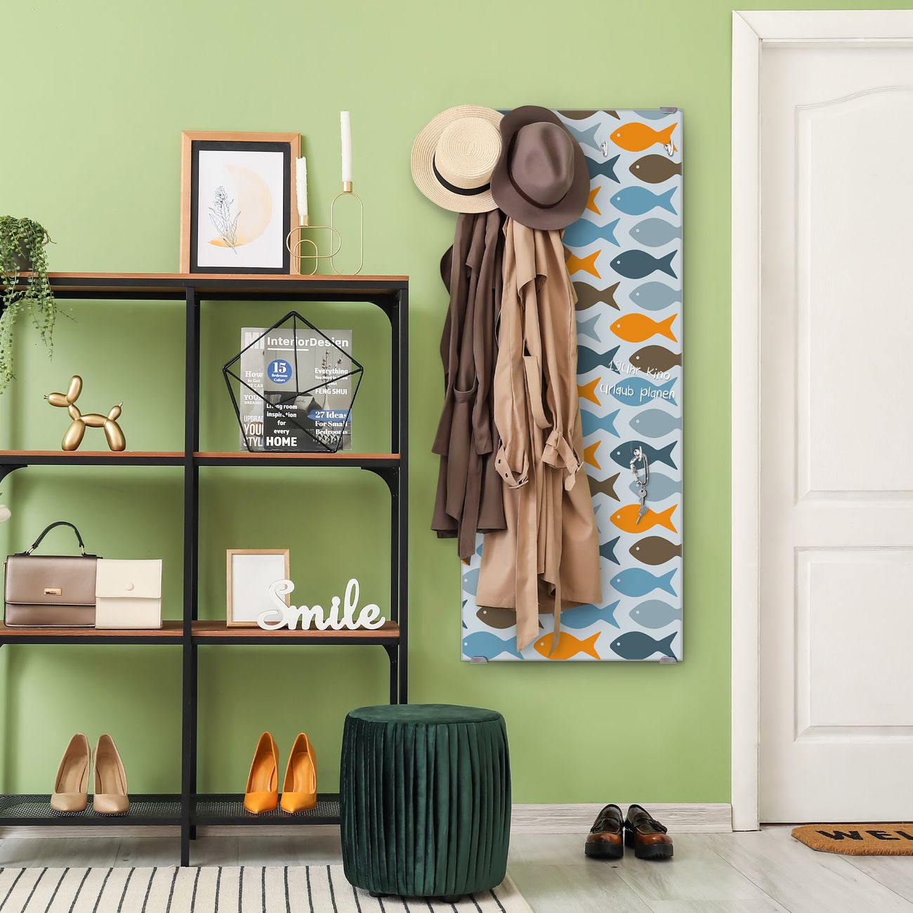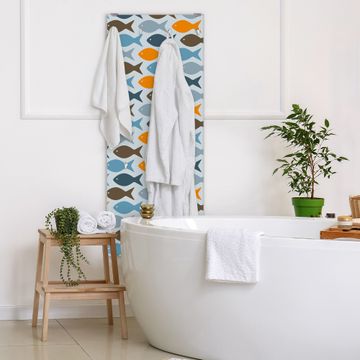 FUNKTION: Die banjado Wandgarderobe mit Motiv Bunte Fische ist Ihr täglicher Begleiter. Zuverlässig hängen hier Ihre Jacken und Mäntel griffbereit. Das Echtglas ist Ihr Paneel auch beschreibbar und wieder abwischbar. DESIGN: Sie erhalten eine Garderobenleiste aus elegantem Echtglas mit dem Farbbrillanten Motiv Bunte Fische hinterklebt. Das Design ist zeitlos klassisch, ohne dabei auf Funktionalität zu verzichten. Suchen Sie aus einer Vielzahl von Motiven das für Ihre Einrichtung Passende aus. DETAILS: Die Flurgarderobe besteht aus 4mm gehärtetem Sicherheitsglas. Sie ist 50cm breit, 125cm hoch und 6cm tief. Die Garderobenhaken zur Selbstmontage präsentieren sich in Edelstahl-Optik, ebenso die Abstandshalter für die Wandmontage. Ihre neue Garderobe ist sofort einsatzbereit. NUTZEN: Ihre neue Garderobe hält nicht nur zuverlässig Ihre Kleidung, sie ist auch optisch ein Blickfang. Durch das Glas können Sie an der Garderobe mit wasserlöslichen Kreidestiften oder Whiteboard-Markern auch Nachrichten hinterlassen. BANJADO: Wir sind ein kleines kreatives Team aus Sachsen und entwickeln Produkte die Design und Funktionalität verbinden sollen. Viel Freude mit Ihrer neuen Garderobe wünscht das banjado-Team!