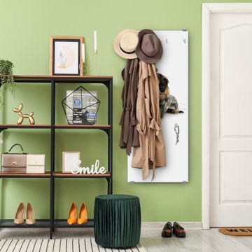 FUNKTION: Die banjado Wandgarderobe mit Motiv Dackel ist Ihr täglicher Begleiter. Zuverlässig hängen hier Ihre Jacken und Mäntel griffbereit. Das Echtglas ist Ihr Paneel auch beschreibbar und wieder abwischbar. DESIGN: Sie erhalten eine Garderobenleiste aus elegantem Echtglas mit dem Farbbrillanten Motiv Dackel hinterklebt. Das Design ist zeitlos klassisch, ohne dabei auf Funktionalität zu verzichten. Suchen Sie aus einer Vielzahl von Motiven das für Ihre Einrichtung Passende aus. DETAILS: Die Flurgarderobe besteht aus 4mm gehärtetem Sicherheitsglas. Sie ist 50cm breit, 125cm hoch und 6cm tief. Die Garderobenhaken zur Selbstmontage präsentieren sich in Edelstahl-Optik, ebenso die Abstandshalter für die Wandmontage. Ihre neue Garderobe ist sofort einsatzbereit. NUTZEN: Ihre neue Garderobe hält nicht nur zuverlässig Ihre Kleidung, sie ist auch optisch ein Blickfang. Durch das Glas können Sie an der Garderobe mit wasserlöslichen Kreidestiften oder Whiteboard-Markern auch Nachrichten hinterlassen. BANJADO: Wir sind ein kleines kreatives Team aus Sachsen und entwickeln Produkte die Design und Funktionalität verbinden sollen. Viel Freude mit Ihrer neuen Garderobe wünscht das banjado-Team!