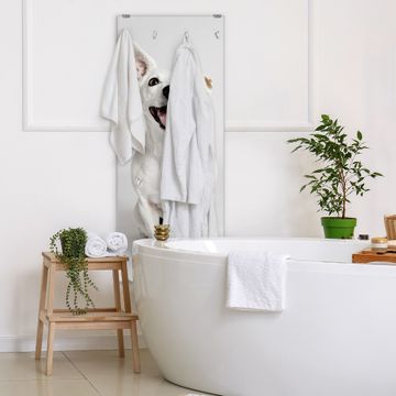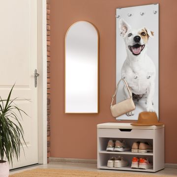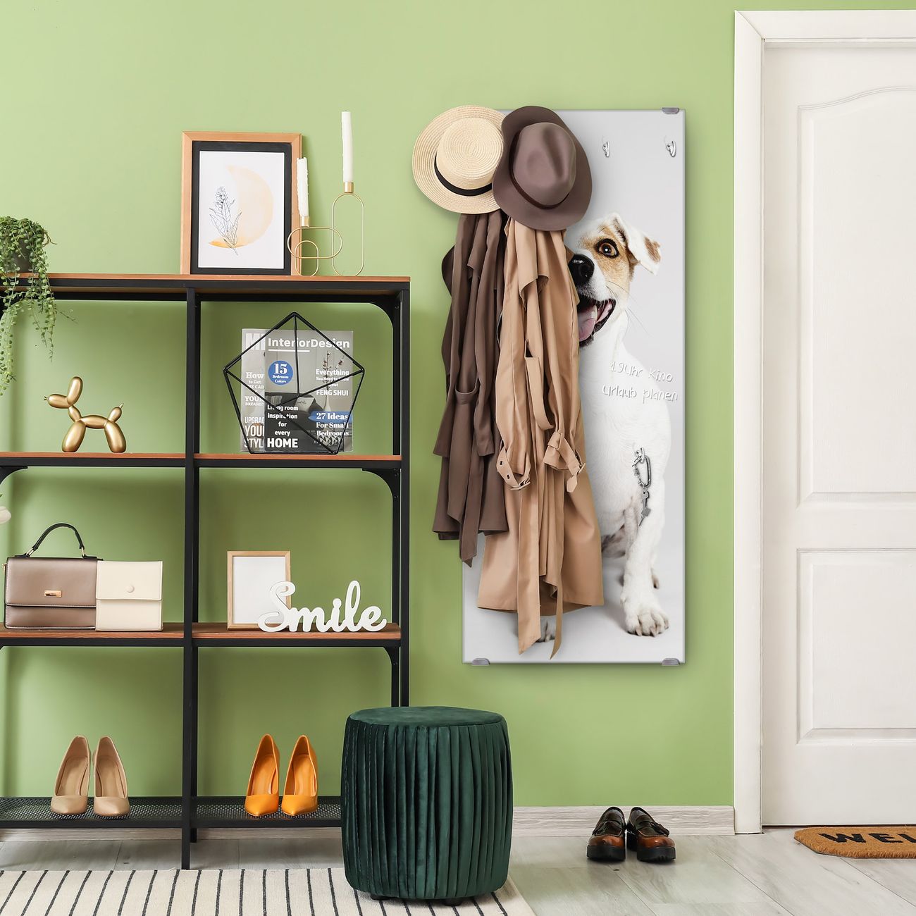 FUNKTION: Die banjado Wandgarderobe mit Motiv Derek ist Ihr täglicher Begleiter. Zuverlässig hängen hier Ihre Jacken und Mäntel griffbereit. Das Echtglas ist Ihr Paneel auch beschreibbar und wieder abwischbar. DESIGN: Sie erhalten eine Garderobenleiste aus elegantem Echtglas mit dem Farbbrillanten Motiv Derek hinterklebt. Das Design ist zeitlos klassisch, ohne dabei auf Funktionalität zu verzichten. Suchen Sie aus einer Vielzahl von Motiven das für Ihre Einrichtung Passende aus. DETAILS: Die Flurgarderobe besteht aus 4mm gehärtetem Sicherheitsglas. Sie ist 50cm breit, 125cm hoch und 6cm tief. Die Garderobenhaken zur Selbstmontage präsentieren sich in Edelstahl-Optik, ebenso die Abstandshalter für die Wandmontage. Ihre neue Garderobe ist sofort einsatzbereit. NUTZEN: Ihre neue Garderobe hält nicht nur zuverlässig Ihre Kleidung, sie ist auch optisch ein Blickfang. Durch das Glas können Sie an der Garderobe mit wasserlöslichen Kreidestiften oder Whiteboard-Markern auch Nachrichten hinterlassen. BANJADO: Wir sind ein kleines kreatives Team aus Sachsen und entwickeln Produkte die Design und Funktionalität verbinden sollen. Viel Freude mit Ihrer neuen Garderobe wünscht das banjado-Team!