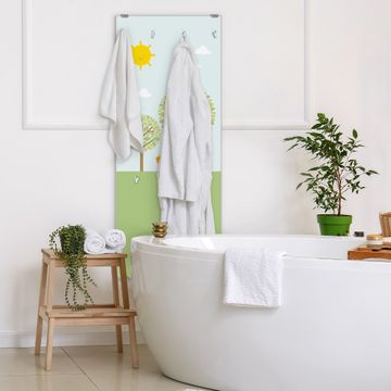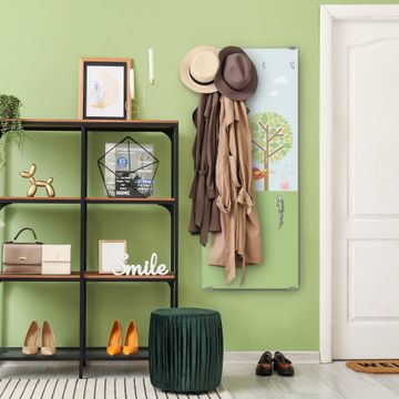 FUNKTION: Die banjado Wandgarderobe mit Motiv Drei Bäume ist Ihr täglicher Begleiter. Zuverlässig hängen hier Ihre Jacken und Mäntel griffbereit. Das Echtglas ist Ihr Paneel auch beschreibbar und wieder abwischbar. DESIGN: Sie erhalten eine Garderobenleiste aus elegantem Echtglas mit dem Farbbrillanten Motiv Drei Bäume hinterklebt. Das Design ist zeitlos klassisch, ohne dabei auf Funktionalität zu verzichten. Suchen Sie aus einer Vielzahl von Motiven das für Ihre Einrichtung Passende aus. DETAILS: Die Flurgarderobe besteht aus 4mm gehärtetem Sicherheitsglas. Sie ist 50cm breit, 125cm hoch und 6cm tief. Die Garderobenhaken zur Selbstmontage präsentieren sich in Edelstahl-Optik, ebenso die Abstandshalter für die Wandmontage. Ihre neue Garderobe ist sofort einsatzbereit. NUTZEN: Ihre neue Garderobe hält nicht nur zuverlässig Ihre Kleidung, sie ist auch optisch ein Blickfang. Durch das Glas können Sie an der Garderobe mit wasserlöslichen Kreidestiften oder Whiteboard-Markern auch Nachrichten hinterlassen. BANJADO: Wir sind ein kleines kreatives Team aus Sachsen und entwickeln Produkte die Design und Funktionalität verbinden sollen. Viel Freude mit Ihrer neuen Garderobe wünscht das banjado-Team!