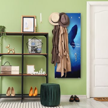 FUNKTION: Die banjado Wandgarderobe mit Motiv Hai ist Ihr täglicher Begleiter. Zuverlässig hängen hier Ihre Jacken und Mäntel griffbereit. Das Echtglas ist Ihr Paneel auch beschreibbar und wieder abwischbar. DESIGN: Sie erhalten eine Garderobenleiste aus elegantem Echtglas mit dem Farbbrillanten Motiv Hai hinterklebt. Das Design ist zeitlos klassisch, ohne dabei auf Funktionalität zu verzichten. Suchen Sie aus einer Vielzahl von Motiven das für Ihre Einrichtung Passende aus. DETAILS: Die Flurgarderobe besteht aus 4mm gehärtetem Sicherheitsglas. Sie ist 50cm breit, 125cm hoch und 6cm tief. Die Garderobenhaken zur Selbstmontage präsentieren sich in Edelstahl-Optik, ebenso die Abstandshalter für die Wandmontage. Ihre neue Garderobe ist sofort einsatzbereit. NUTZEN: Ihre neue Garderobe hält nicht nur zuverlässig Ihre Kleidung, sie ist auch optisch ein Blickfang. Durch das Glas können Sie an der Garderobe mit wasserlöslichen Kreidestiften oder Whiteboard-Markern auch Nachrichten hinterlassen. BANJADO: Wir sind ein kleines kreatives Team aus Sachsen und entwickeln Produkte die Design und Funktionalität verbinden sollen. Viel Freude mit Ihrer neuen Garderobe wünscht das banjado-Team!