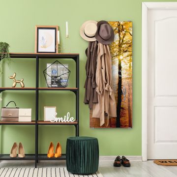 FUNKTION: Die banjado Wandgarderobe mit Motiv Herbstwald ist Ihr täglicher Begleiter. Zuverlässig hängen hier Ihre Jacken und Mäntel griffbereit. Das Echtglas ist Ihr Paneel auch beschreibbar und wieder abwischbar. DESIGN: Sie erhalten eine Garderobenleiste aus elegantem Echtglas mit dem Farbbrillanten Motiv Herbstwald hinterklebt. Das Design ist zeitlos klassisch, ohne dabei auf Funktionalität zu verzichten. Suchen Sie aus einer Vielzahl von Motiven das für Ihre Einrichtung Passende aus. DETAILS: Die Flurgarderobe besteht aus 4mm gehärtetem Sicherheitsglas. Sie ist 50cm breit, 125cm hoch und 6cm tief. Die Garderobenhaken zur Selbstmontage präsentieren sich in Edelstahl-Optik, ebenso die Abstandshalter für die Wandmontage. Ihre neue Garderobe ist sofort einsatzbereit. NUTZEN: Ihre neue Garderobe hält nicht nur zuverlässig Ihre Kleidung, sie ist auch optisch ein Blickfang. Durch das Glas können Sie an der Garderobe mit wasserlöslichen Kreidestiften oder Whiteboard-Markern auch Nachrichten hinterlassen. BANJADO: Wir sind ein kleines kreatives Team aus Sachsen und entwickeln Produkte die Design und Funktionalität verbinden sollen. Viel Freude mit Ihrer neuen Garderobe wünscht das banjado-Team!