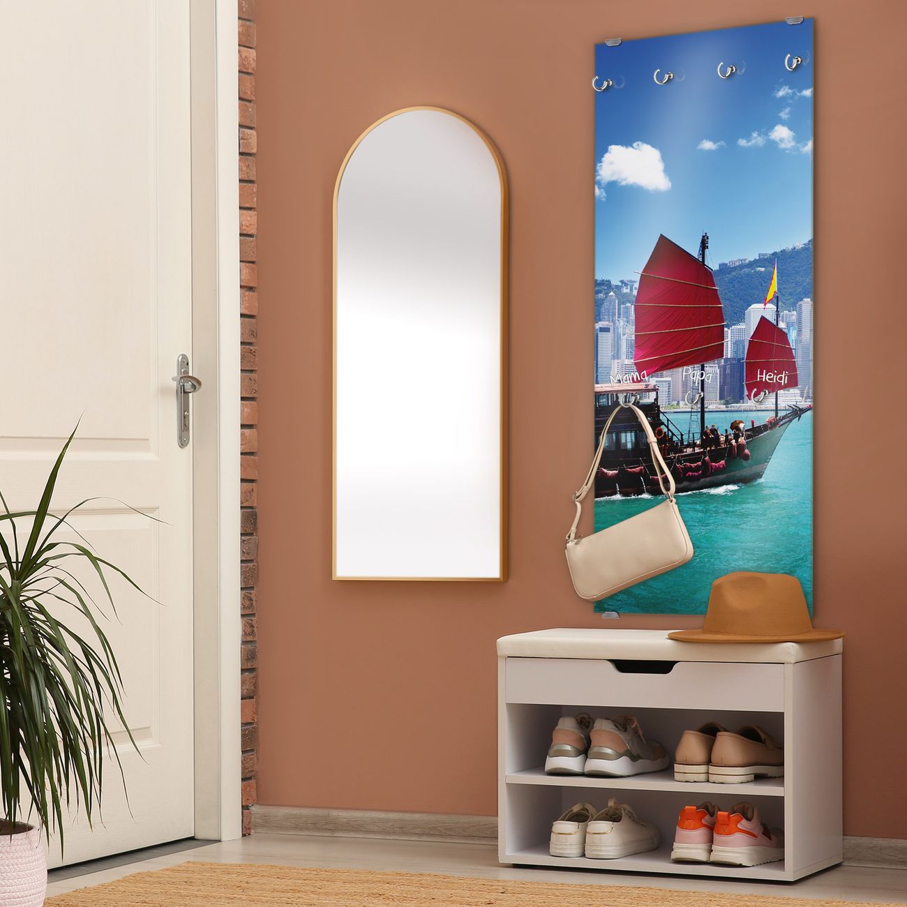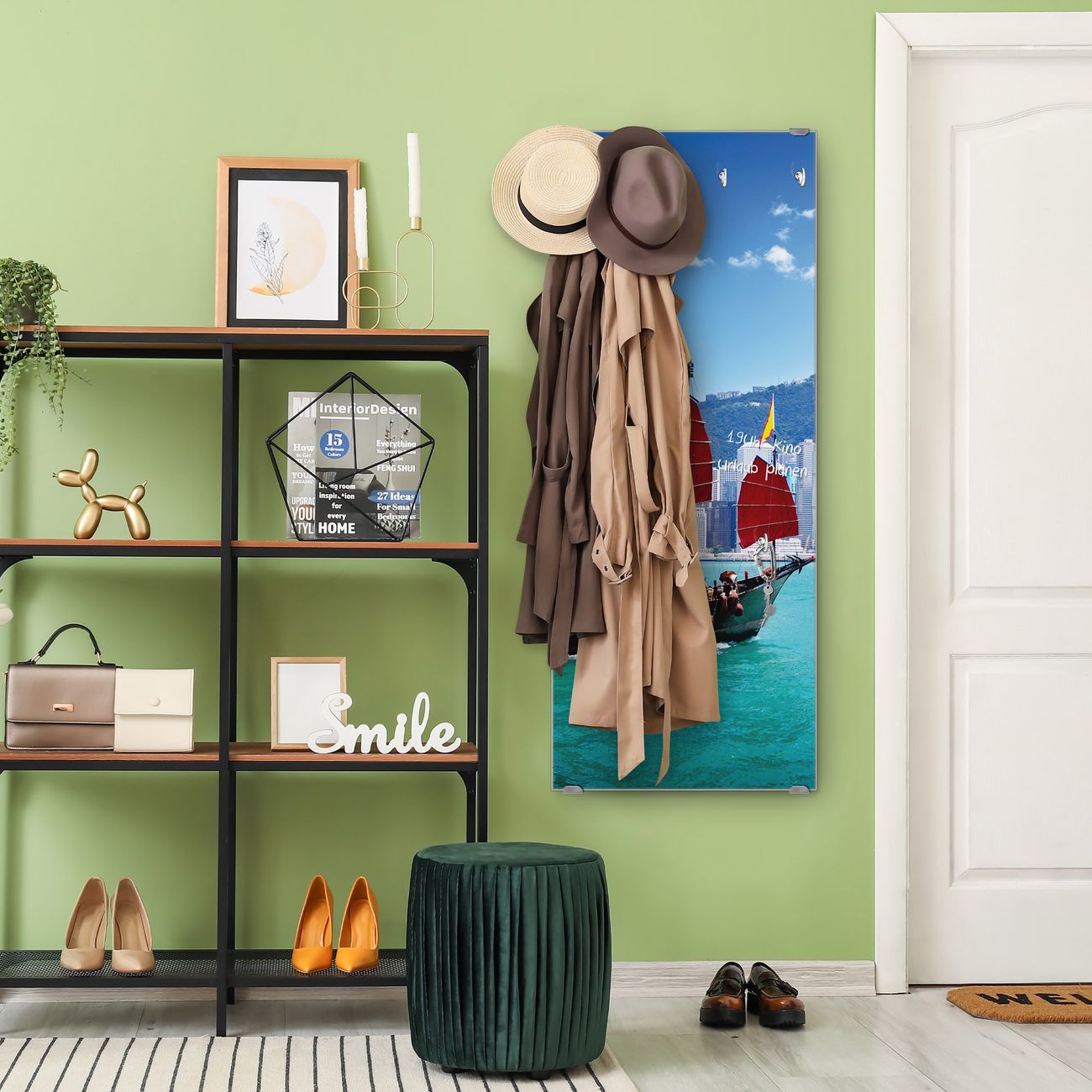 FUNKTION: Die banjado Wandgarderobe mit Motiv Hong Kong ist Ihr täglicher Begleiter. Zuverlässig hängen hier Ihre Jacken und Mäntel griffbereit. Das Echtglas ist Ihr Paneel auch beschreibbar und wieder abwischbar. DESIGN: Sie erhalten eine Garderobenleiste aus elegantem Echtglas mit dem Farbbrillanten Motiv Hong Kong hinterklebt. Das Design ist zeitlos klassisch, ohne dabei auf Funktionalität zu verzichten. Suchen Sie aus einer Vielzahl von Motiven das für Ihre Einrichtung Passende aus. DETAILS: Die Flurgarderobe besteht aus 4mm gehärtetem Sicherheitsglas. Sie ist 50cm breit, 125cm hoch und 6cm tief. Die Garderobenhaken zur Selbstmontage präsentieren sich in Edelstahl-Optik, ebenso die Abstandshalter für die Wandmontage. Ihre neue Garderobe ist sofort einsatzbereit. NUTZEN: Ihre neue Garderobe hält nicht nur zuverlässig Ihre Kleidung, sie ist auch optisch ein Blickfang. Durch das Glas können Sie an der Garderobe mit wasserlöslichen Kreidestiften oder Whiteboard-Markern auch Nachrichten hinterlassen. BANJADO: Wir sind ein kleines kreatives Team aus Sachsen und entwickeln Produkte die Design und Funktionalität verbinden sollen. Viel Freude mit Ihrer neuen Garderobe wünscht das banjado-Team!