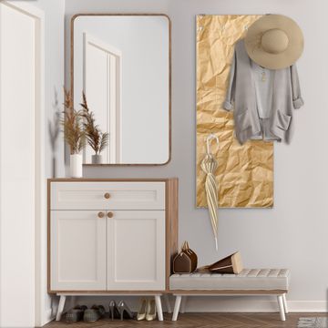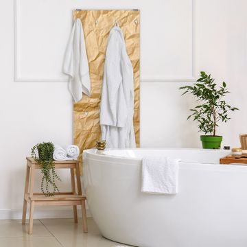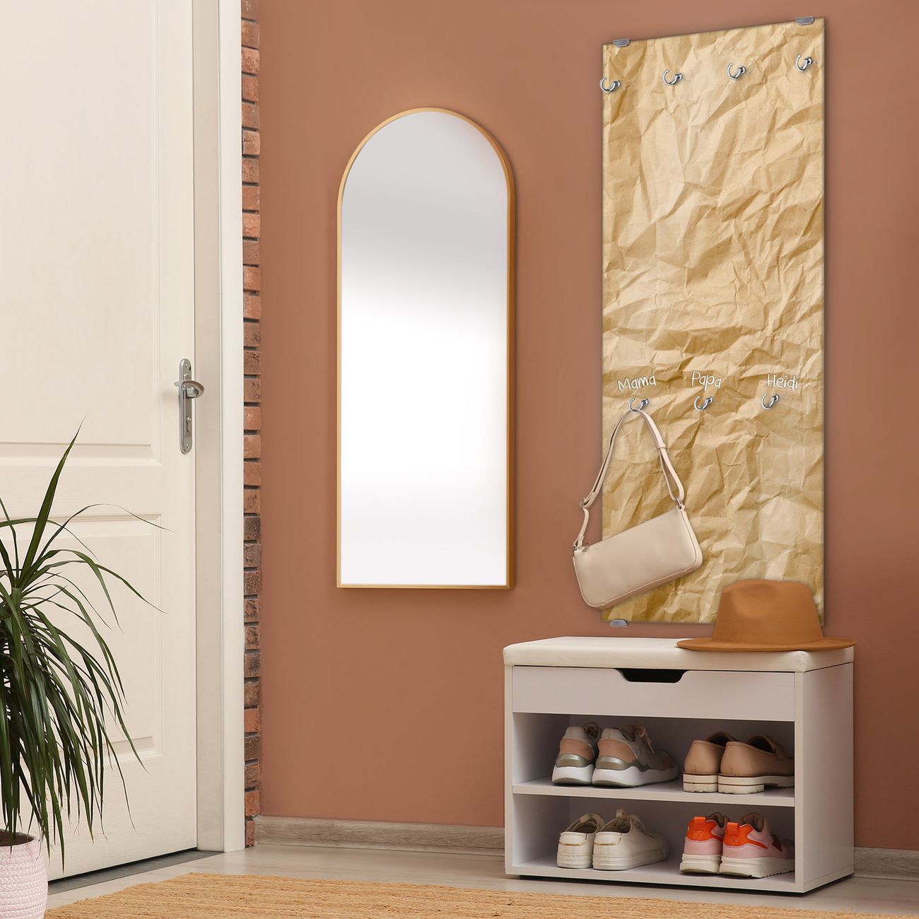 FUNKTION: Die banjado Wandgarderobe mit Motiv Knüllpapier ist Ihr täglicher Begleiter. Zuverlässig hängen hier Ihre Jacken und Mäntel griffbereit. Das Echtglas ist Ihr Paneel auch beschreibbar und wieder abwischbar. DESIGN: Sie erhalten eine Garderobenleiste aus elegantem Echtglas mit dem Farbbrillanten Motiv Knüllpapier hinterklebt. Das Design ist zeitlos klassisch, ohne dabei auf Funktionalität zu verzichten. Suchen Sie aus einer Vielzahl von Motiven das für Ihre Einrichtung Passende aus. DETAILS: Die Flurgarderobe besteht aus 4mm gehärtetem Sicherheitsglas. Sie ist 50cm breit, 125cm hoch und 6cm tief. Die Garderobenhaken zur Selbstmontage präsentieren sich in Edelstahl-Optik, ebenso die Abstandshalter für die Wandmontage. Ihre neue Garderobe ist sofort einsatzbereit. NUTZEN: Ihre neue Garderobe hält nicht nur zuverlässig Ihre Kleidung, sie ist auch optisch ein Blickfang. Durch das Glas können Sie an der Garderobe mit wasserlöslichen Kreidestiften oder Whiteboard-Markern auch Nachrichten hinterlassen. BANJADO: Wir sind ein kleines kreatives Team aus Sachsen und entwickeln Produkte die Design und Funktionalität verbinden sollen. Viel Freude mit Ihrer neuen Garderobe wünscht das banjado-Team!