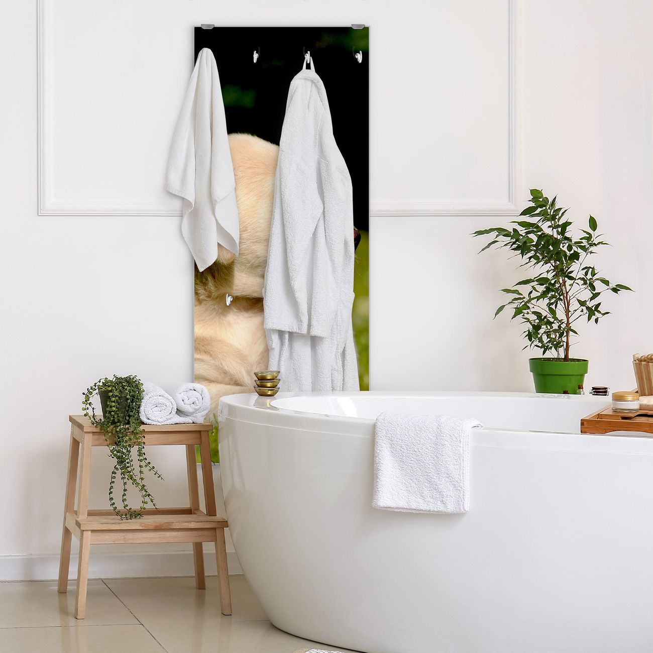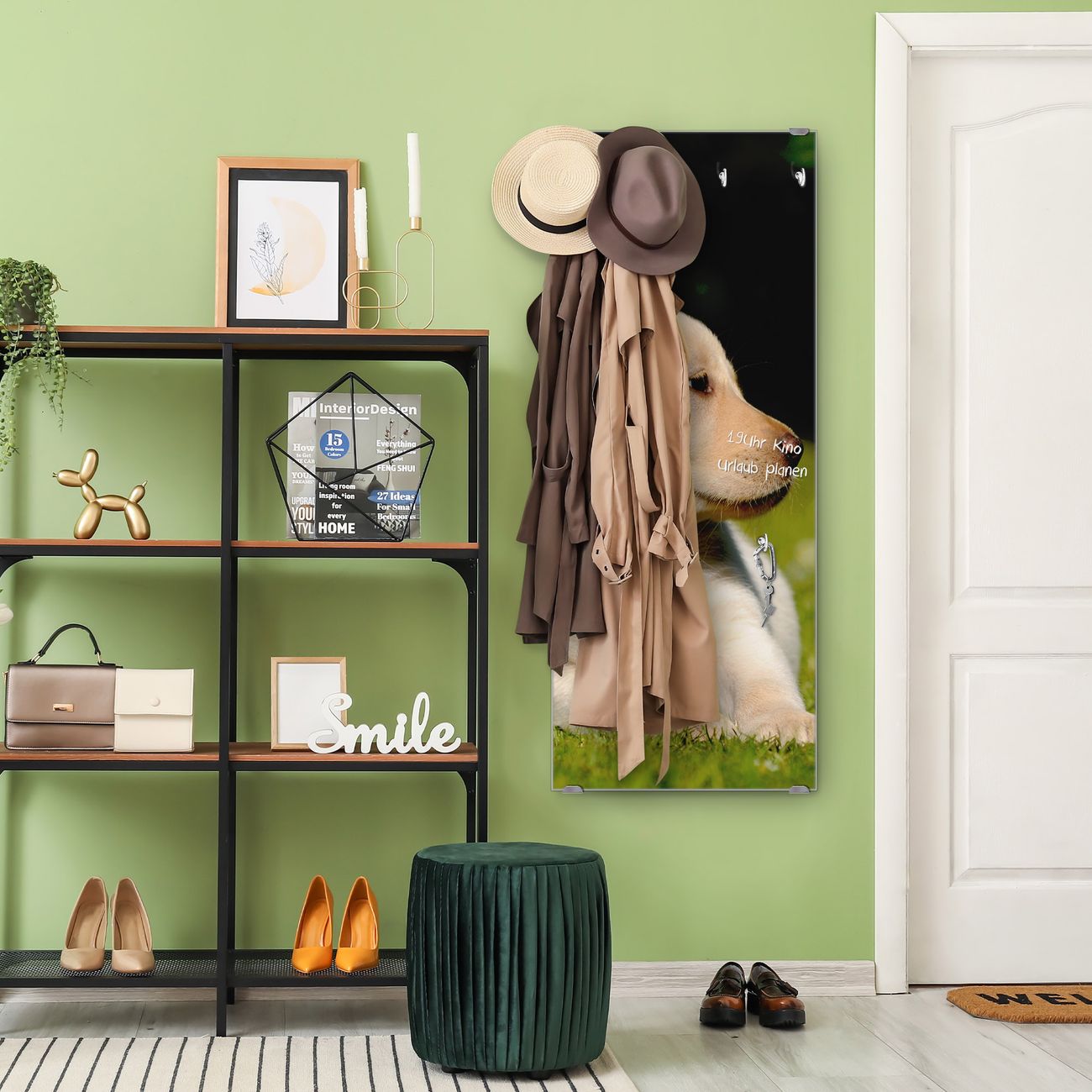 FUNKTION: Die banjado Wandgarderobe mit Motiv Labrador ist Ihr täglicher Begleiter. Zuverlässig hängen hier Ihre Jacken und Mäntel griffbereit. Das Echtglas ist Ihr Paneel auch beschreibbar und wieder abwischbar. DESIGN: Sie erhalten eine Garderobenleiste aus elegantem Echtglas mit dem Farbbrillanten Motiv Labrador hinterklebt. Das Design ist zeitlos klassisch, ohne dabei auf Funktionalität zu verzichten. Suchen Sie aus einer Vielzahl von Motiven das für Ihre Einrichtung Passende aus. DETAILS: Die Flurgarderobe besteht aus 4mm gehärtetem Sicherheitsglas. Sie ist 50cm breit, 125cm hoch und 6cm tief. Die Garderobenhaken zur Selbstmontage präsentieren sich in Edelstahl-Optik, ebenso die Abstandshalter für die Wandmontage. Ihre neue Garderobe ist sofort einsatzbereit. NUTZEN: Ihre neue Garderobe hält nicht nur zuverlässig Ihre Kleidung, sie ist auch optisch ein Blickfang. Durch das Glas können Sie an der Garderobe mit wasserlöslichen Kreidestiften oder Whiteboard-Markern auch Nachrichten hinterlassen. BANJADO: Wir sind ein kleines kreatives Team aus Sachsen und entwickeln Produkte die Design und Funktionalität verbinden sollen. Viel Freude mit Ihrer neuen Garderobe wünscht das banjado-Team!