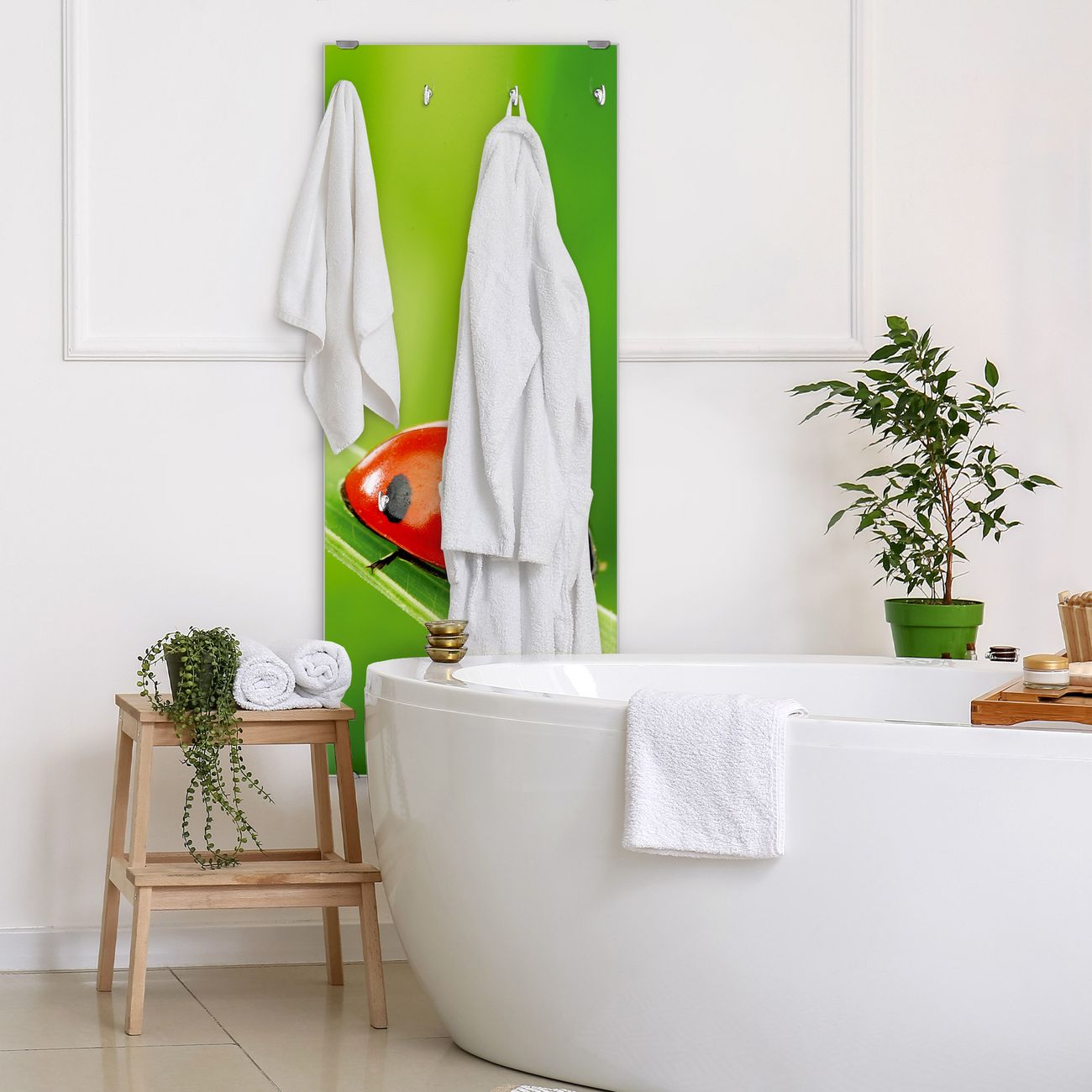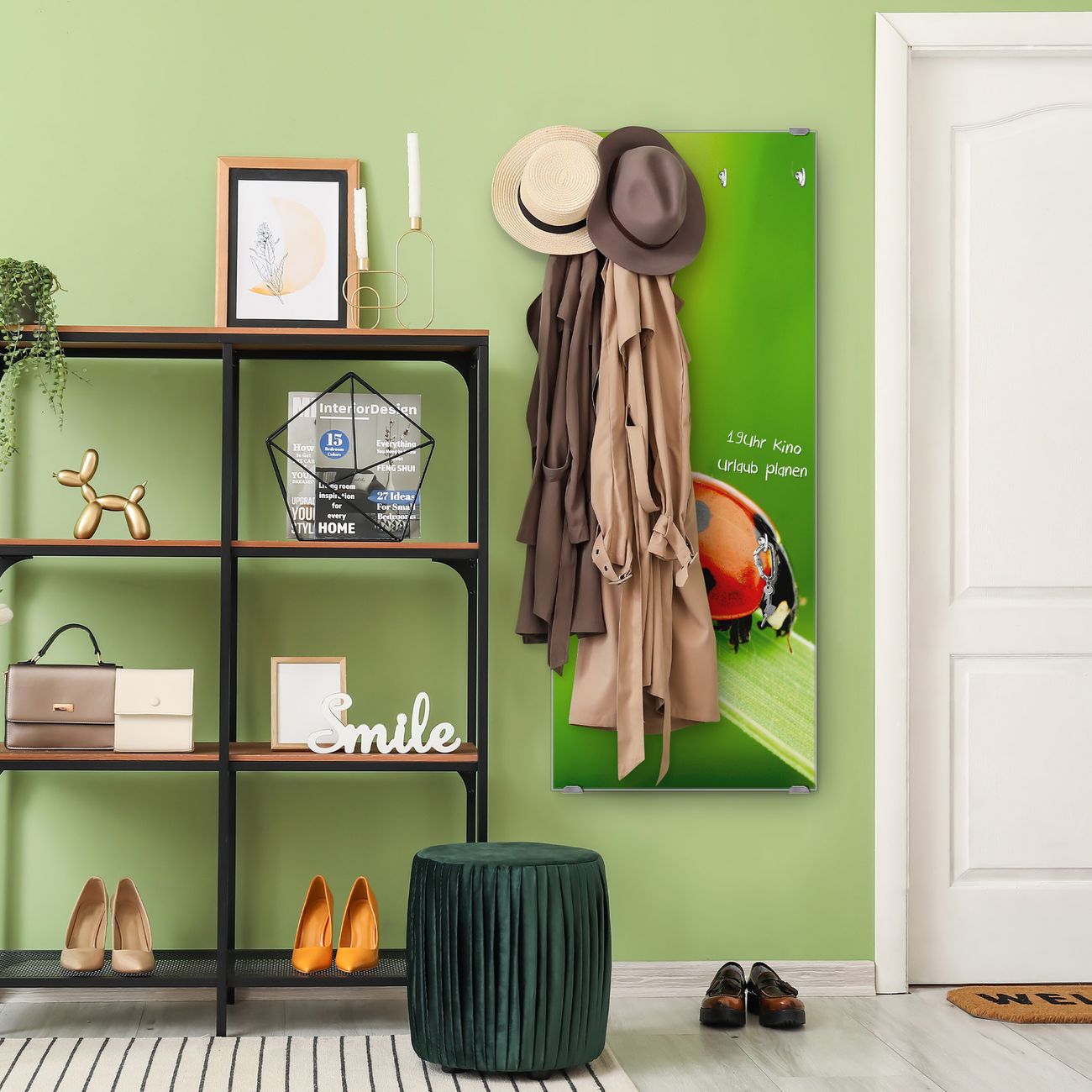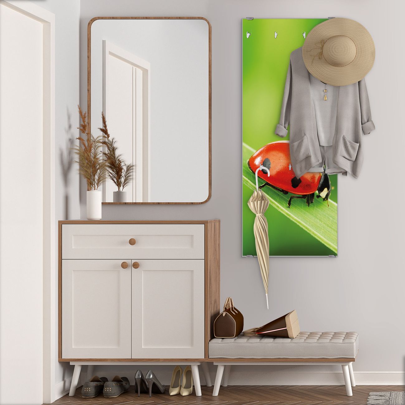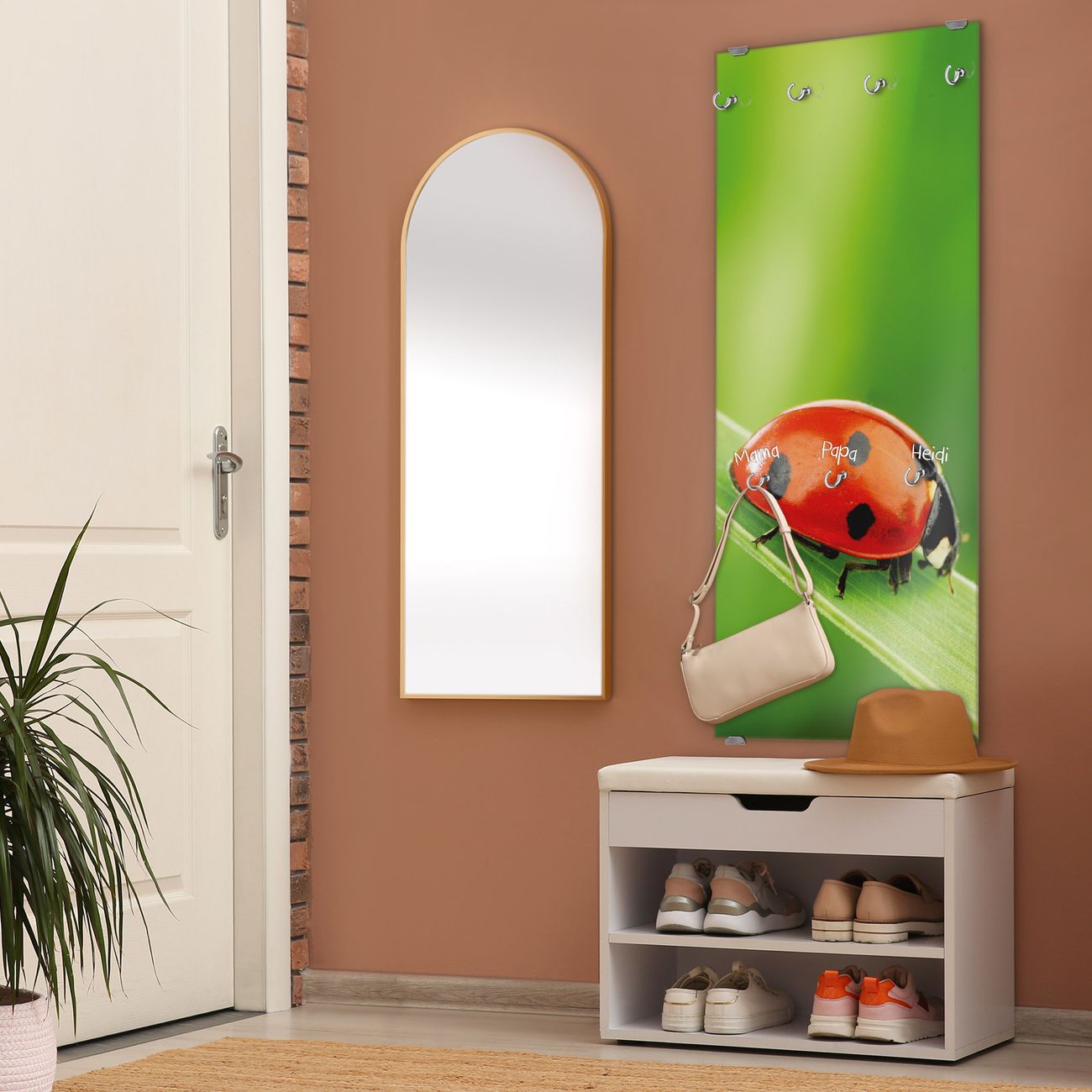FUNKTION: Die banjado Wandgarderobe mit Motiv Marienkäfer ist Ihr täglicher Begleiter. Zuverlässig hängen hier Ihre Jacken und Mäntel griffbereit. Das Echtglas ist Ihr Paneel auch beschreibbar und wieder abwischbar. DESIGN: Sie erhalten eine Garderobenleiste aus elegantem Echtglas mit dem Farbbrillanten Motiv Marienkäfer hinterklebt. Das Design ist zeitlos klassisch, ohne dabei auf Funktionalität zu verzichten. Suchen Sie aus einer Vielzahl von Motiven das für Ihre Einrichtung Passende aus. DETAILS: Die Flurgarderobe besteht aus 4mm gehärtetem Sicherheitsglas. Sie ist 50cm breit, 125cm hoch und 6cm tief. Die Garderobenhaken zur Selbstmontage präsentieren sich in Edelstahl-Optik, ebenso die Abstandshalter für die Wandmontage. Ihre neue Garderobe ist sofort einsatzbereit. NUTZEN: Ihre neue Garderobe hält nicht nur zuverlässig Ihre Kleidung, sie ist auch optisch ein Blickfang. Durch das Glas können Sie an der Garderobe mit wasserlöslichen Kreidestiften oder Whiteboard-Markern auch Nachrichten hinterlassen. BANJADO: Wir sind ein kleines kreatives Team aus Sachsen und entwickeln Produkte die Design und Funktionalität verbinden sollen. Viel Freude mit Ihrer neuen Garderobe wünscht das banjado-Team!