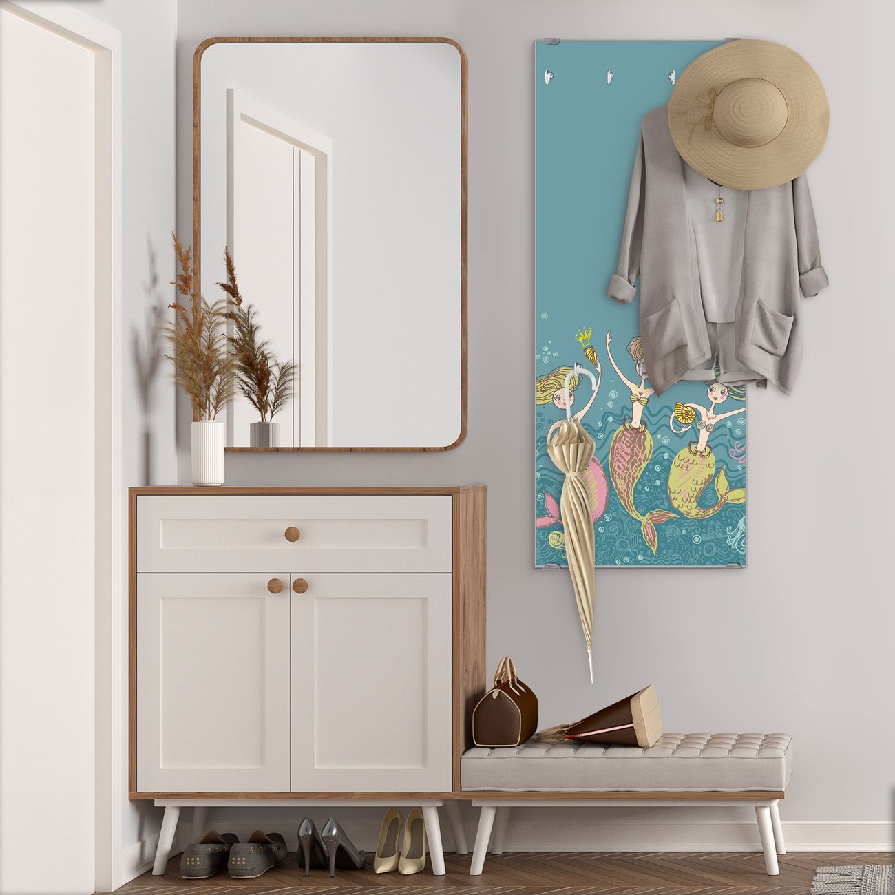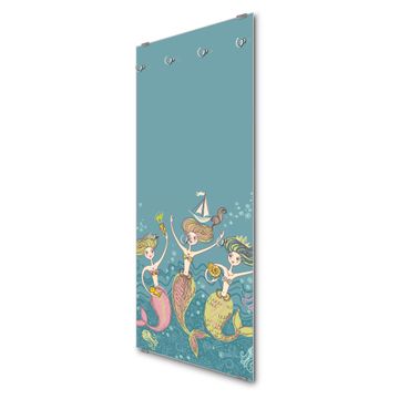 FUNKTION: Die banjado Wandgarderobe mit Motiv Nixen ist Ihr täglicher Begleiter. Zuverlässig hängen hier Ihre Jacken und Mäntel griffbereit. Das Echtglas ist Ihr Paneel auch beschreibbar und wieder abwischbar. DESIGN: Sie erhalten eine Garderobenleiste aus elegantem Echtglas mit dem Farbbrillanten Motiv Nixen hinterklebt. Das Design ist zeitlos klassisch, ohne dabei auf Funktionalität zu verzichten. Suchen Sie aus einer Vielzahl von Motiven das für Ihre Einrichtung Passende aus. DETAILS: Die Flurgarderobe besteht aus 4mm gehärtetem Sicherheitsglas. Sie ist 50cm breit, 125cm hoch und 6cm tief. Die Garderobenhaken zur Selbstmontage präsentieren sich in Edelstahl-Optik, ebenso die Abstandshalter für die Wandmontage. Ihre neue Garderobe ist sofort einsatzbereit. NUTZEN: Ihre neue Garderobe hält nicht nur zuverlässig Ihre Kleidung, sie ist auch optisch ein Blickfang. Durch das Glas können Sie an der Garderobe mit wasserlöslichen Kreidestiften oder Whiteboard-Markern auch Nachrichten hinterlassen. BANJADO: Wir sind ein kleines kreatives Team aus Sachsen und entwickeln Produkte die Design und Funktionalität verbinden sollen. Viel Freude mit Ihrer neuen Garderobe wünscht das banjado-Team!
