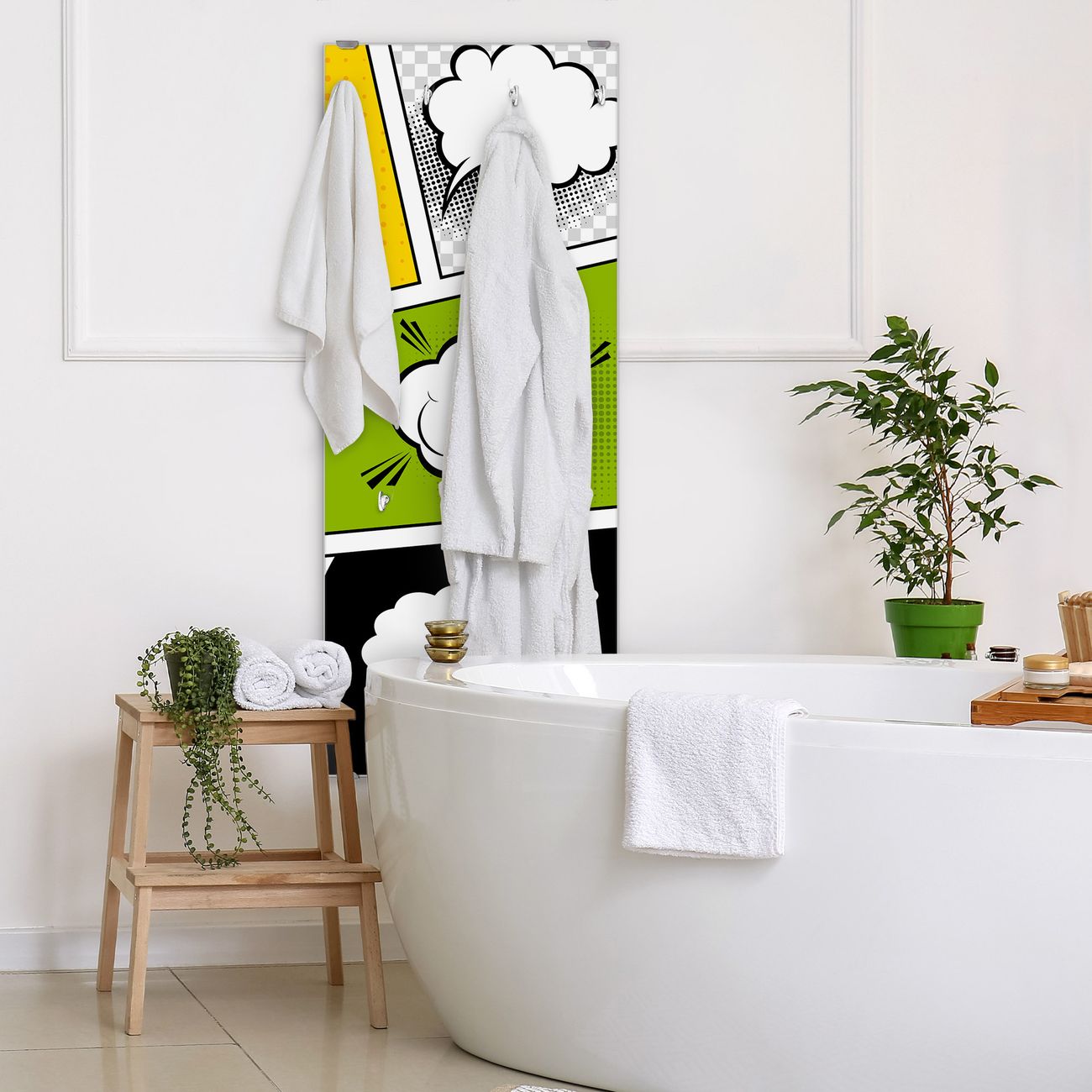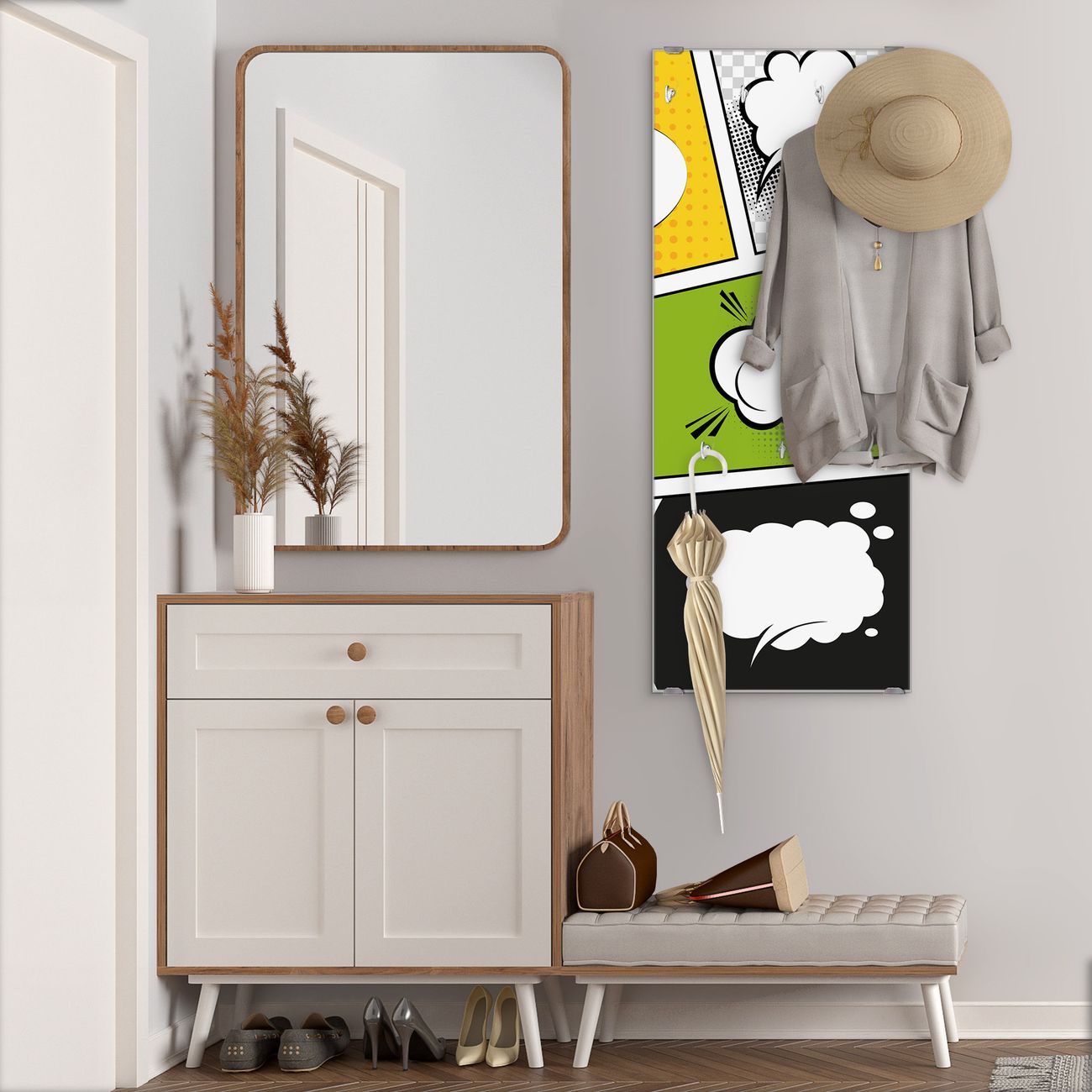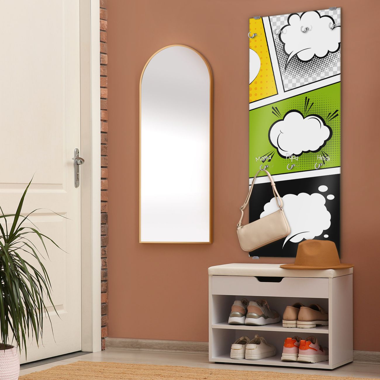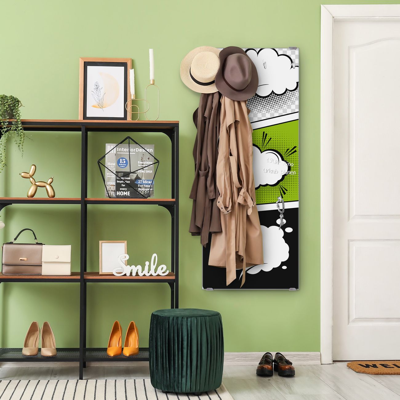 FUNKTION: Die banjado Wandgarderobe mit Motiv Ohne Worte ist Ihr täglicher Begleiter. Zuverlässig hängen hier Ihre Jacken und Mäntel griffbereit. Das Echtglas ist Ihr Paneel auch beschreibbar und wieder abwischbar. DESIGN: Sie erhalten eine Garderobenleiste aus elegantem Echtglas mit dem Farbbrillanten Motiv Ohne Worte hinterklebt. Das Design ist zeitlos klassisch, ohne dabei auf Funktionalität zu verzichten. Suchen Sie aus einer Vielzahl von Motiven das für Ihre Einrichtung Passende aus. DETAILS: Die Flurgarderobe besteht aus 4mm gehärtetem Sicherheitsglas. Sie ist 50cm breit, 125cm hoch und 6cm tief. Die Garderobenhaken zur Selbstmontage präsentieren sich in Edelstahl-Optik, ebenso die Abstandshalter für die Wandmontage. Ihre neue Garderobe ist sofort einsatzbereit. NUTZEN: Ihre neue Garderobe hält nicht nur zuverlässig Ihre Kleidung, sie ist auch optisch ein Blickfang. Durch das Glas können Sie an der Garderobe mit wasserlöslichen Kreidestiften oder Whiteboard-Markern auch Nachrichten hinterlassen. BANJADO: Wir sind ein kleines kreatives Team aus Sachsen und entwickeln Produkte die Design und Funktionalität verbinden sollen. Viel Freude mit Ihrer neuen Garderobe wünscht das banjado-Team!