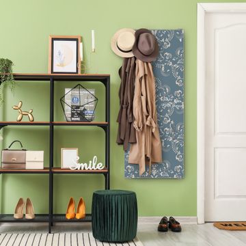 FUNKTION: Die banjado Wandgarderobe mit Motiv Royal Creme Blau ist Ihr täglicher Begleiter. Zuverlässig hängen hier Ihre Jacken und Mäntel griffbereit. Das Echtglas ist Ihr Paneel auch beschreibbar und wieder abwischbar. DESIGN: Sie erhalten eine Garderobenleiste aus elegantem Echtglas mit dem Farbbrillanten Motiv Royal Creme Blau hinterklebt. Das Design ist zeitlos klassisch, ohne dabei auf Funktionalität zu verzichten. Suchen Sie aus einer Vielzahl von Motiven das für Ihre Einrichtung Passende aus. DETAILS: Die Flurgarderobe besteht aus 4mm gehärtetem Sicherheitsglas. Sie ist 50cm breit, 125cm hoch und 6cm tief. Die Garderobenhaken zur Selbstmontage präsentieren sich in Edelstahl-Optik, ebenso die Abstandshalter für die Wandmontage. Ihre neue Garderobe ist sofort einsatzbereit. NUTZEN: Ihre neue Garderobe hält nicht nur zuverlässig Ihre Kleidung, sie ist auch optisch ein Blickfang. Durch das Glas können Sie an der Garderobe mit wasserlöslichen Kreidestiften oder Whiteboard-Markern auch Nachrichten hinterlassen. BANJADO: Wir sind ein kleines kreatives Team aus Sachsen und entwickeln Produkte die Design und Funktionalität verbinden sollen. Viel Freude mit Ihrer neuen Garderobe wünscht das banjado-Team!
