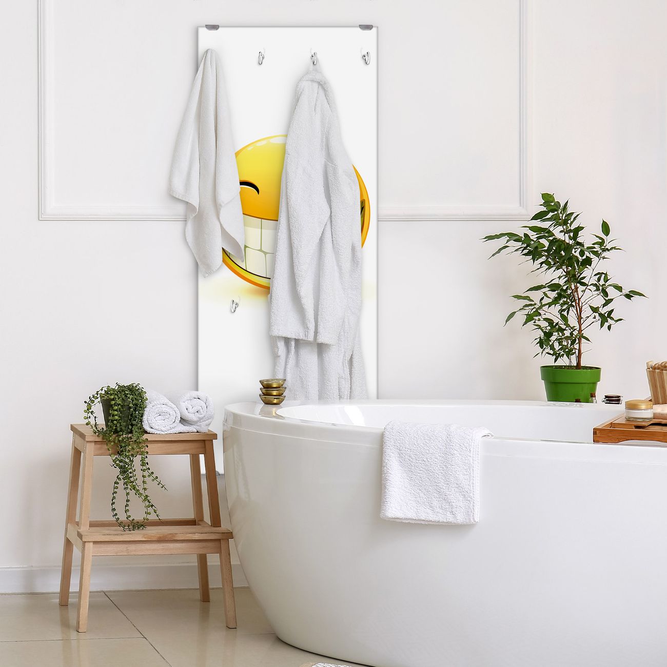 FUNKTION: Die banjado Wandgarderobe mit Motiv Smile ist Ihr täglicher Begleiter. Zuverlässig hängen hier Ihre Jacken und Mäntel griffbereit. Das Echtglas ist Ihr Paneel auch beschreibbar und wieder abwischbar. DESIGN: Sie erhalten eine Garderobenleiste aus elegantem Echtglas mit dem Farbbrillanten Motiv Smile hinterklebt. Das Design ist zeitlos klassisch, ohne dabei auf Funktionalität zu verzichten. Suchen Sie aus einer Vielzahl von Motiven das für Ihre Einrichtung Passende aus. DETAILS: Die Flurgarderobe besteht aus 4mm gehärtetem Sicherheitsglas. Sie ist 50cm breit, 125cm hoch und 6cm tief. Die Garderobenhaken zur Selbstmontage präsentieren sich in Edelstahl-Optik, ebenso die Abstandshalter für die Wandmontage. Ihre neue Garderobe ist sofort einsatzbereit. NUTZEN: Ihre neue Garderobe hält nicht nur zuverlässig Ihre Kleidung, sie ist auch optisch ein Blickfang. Durch das Glas können Sie an der Garderobe mit wasserlöslichen Kreidestiften oder Whiteboard-Markern auch Nachrichten hinterlassen. BANJADO: Wir sind ein kleines kreatives Team aus Sachsen und entwickeln Produkte die Design und Funktionalität verbinden sollen. Viel Freude mit Ihrer neuen Garderobe wünscht das banjado-Team!