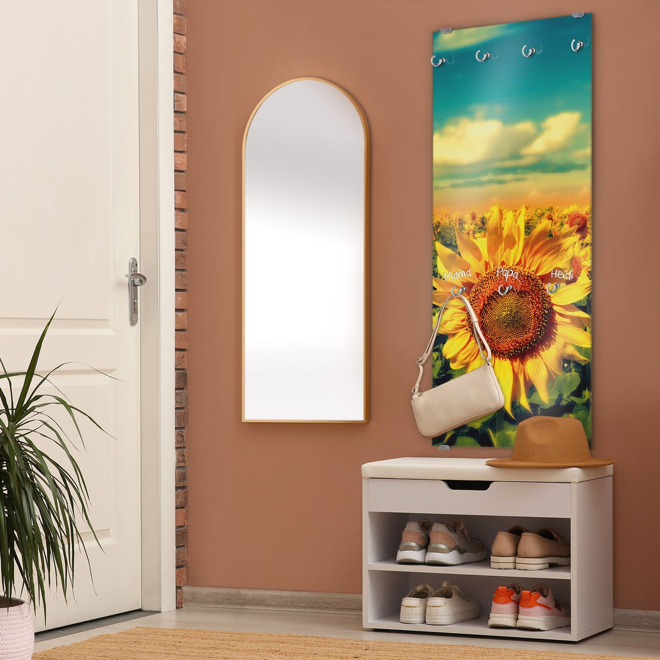 FUNKTION: Die banjado Wandgarderobe mit Motiv Sonnenblumen ist Ihr täglicher Begleiter. Zuverlässig hängen hier Ihre Jacken und Mäntel griffbereit. Das Echtglas ist Ihr Paneel auch beschreibbar und wieder abwischbar. DESIGN: Sie erhalten eine Garderobenleiste aus elegantem Echtglas mit dem Farbbrillanten Motiv Sonnenblumen hinterklebt. Das Design ist zeitlos klassisch, ohne dabei auf Funktionalität zu verzichten. Suchen Sie aus einer Vielzahl von Motiven das für Ihre Einrichtung Passende aus. DETAILS: Die Flurgarderobe besteht aus 4mm gehärtetem Sicherheitsglas. Sie ist 50cm breit, 125cm hoch und 6cm tief. Die Garderobenhaken zur Selbstmontage präsentieren sich in Edelstahl-Optik, ebenso die Abstandshalter für die Wandmontage. Ihre neue Garderobe ist sofort einsatzbereit. NUTZEN: Ihre neue Garderobe hält nicht nur zuverlässig Ihre Kleidung, sie ist auch optisch ein Blickfang. Durch das Glas können Sie an der Garderobe mit wasserlöslichen Kreidestiften oder Whiteboard-Markern auch Nachrichten hinterlassen. BANJADO: Wir sind ein kleines kreatives Team aus Sachsen und entwickeln Produkte die Design und Funktionalität verbinden sollen. Viel Freude mit Ihrer neuen Garderobe wünscht das banjado-Team!