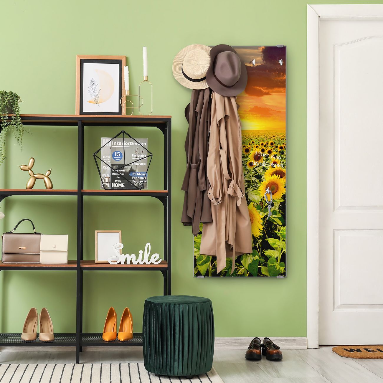 FUNKTION: Die banjado Wandgarderobe mit Motiv Sonnenblumenmeer ist Ihr täglicher Begleiter. Zuverlässig hängen hier Ihre Jacken und Mäntel griffbereit. Das Echtglas ist Ihr Paneel auch beschreibbar und wieder abwischbar. DESIGN: Sie erhalten eine Garderobenleiste aus elegantem Echtglas mit dem Farbbrillanten Motiv Sonnenblumenmeer hinterklebt. Das Design ist zeitlos klassisch, ohne dabei auf Funktionalität zu verzichten. Suchen Sie aus einer Vielzahl von Motiven das für Ihre Einrichtung Passende aus. DETAILS: Die Flurgarderobe besteht aus 4mm gehärtetem Sicherheitsglas. Sie ist 50cm breit, 125cm hoch und 6cm tief. Die Garderobenhaken zur Selbstmontage präsentieren sich in Edelstahl-Optik, ebenso die Abstandshalter für die Wandmontage. Ihre neue Garderobe ist sofort einsatzbereit. NUTZEN: Ihre neue Garderobe hält nicht nur zuverlässig Ihre Kleidung, sie ist auch optisch ein Blickfang. Durch das Glas können Sie an der Garderobe mit wasserlöslichen Kreidestiften oder Whiteboard-Markern auch Nachrichten hinterlassen. BANJADO: Wir sind ein kleines kreatives Team aus Sachsen und entwickeln Produkte die Design und Funktionalität verbinden sollen. Viel Freude mit Ihrer neuen Garderobe wünscht das banjado-Team!
