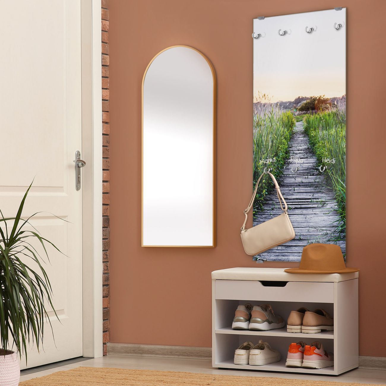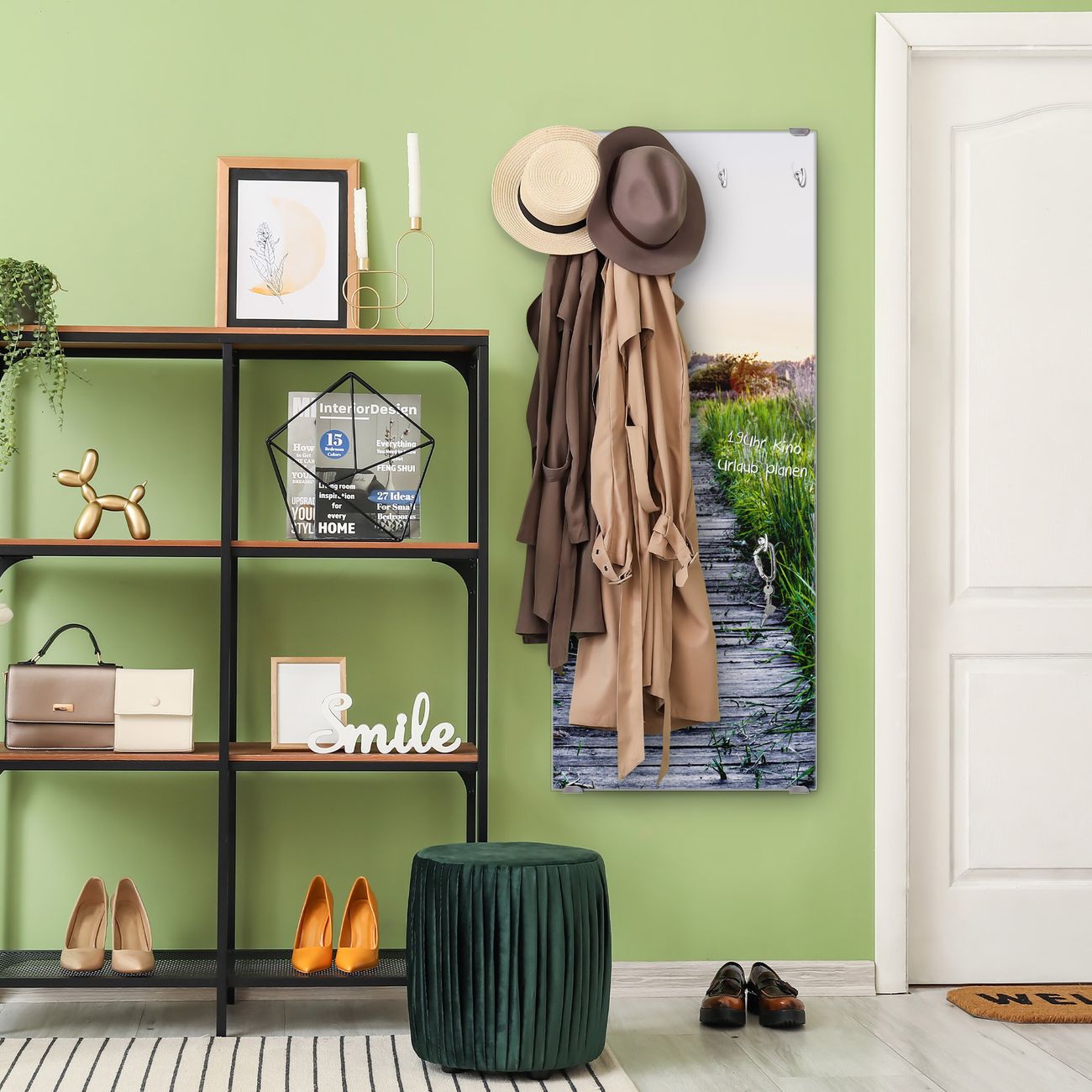 FUNKTION: Die banjado Wandgarderobe mit Motiv Steg Durchs Schilf ist Ihr täglicher Begleiter. Zuverlässig hängen hier Ihre Jacken und Mäntel griffbereit. Das Echtglas ist Ihr Paneel auch beschreibbar und wieder abwischbar. DESIGN: Sie erhalten eine Garderobenleiste aus elegantem Echtglas mit dem Farbbrillanten Motiv Steg Durchs Schilf hinterklebt. Das Design ist zeitlos klassisch, ohne dabei auf Funktionalität zu verzichten. Suchen Sie aus einer Vielzahl von Motiven das für Ihre Einrichtung Passende aus. DETAILS: Die Flurgarderobe besteht aus 4mm gehärtetem Sicherheitsglas. Sie ist 50cm breit, 125cm hoch und 6cm tief. Die Garderobenhaken zur Selbstmontage präsentieren sich in Edelstahl-Optik, ebenso die Abstandshalter für die Wandmontage. Ihre neue Garderobe ist sofort einsatzbereit. NUTZEN: Ihre neue Garderobe hält nicht nur zuverlässig Ihre Kleidung, sie ist auch optisch ein Blickfang. Durch das Glas können Sie an der Garderobe mit wasserlöslichen Kreidestiften oder Whiteboard-Markern auch Nachrichten hinterlassen. BANJADO: Wir sind ein kleines kreatives Team aus Sachsen und entwickeln Produkte die Design und Funktionalität verbinden sollen. Viel Freude mit Ihrer neuen Garderobe wünscht das banjado-Team!