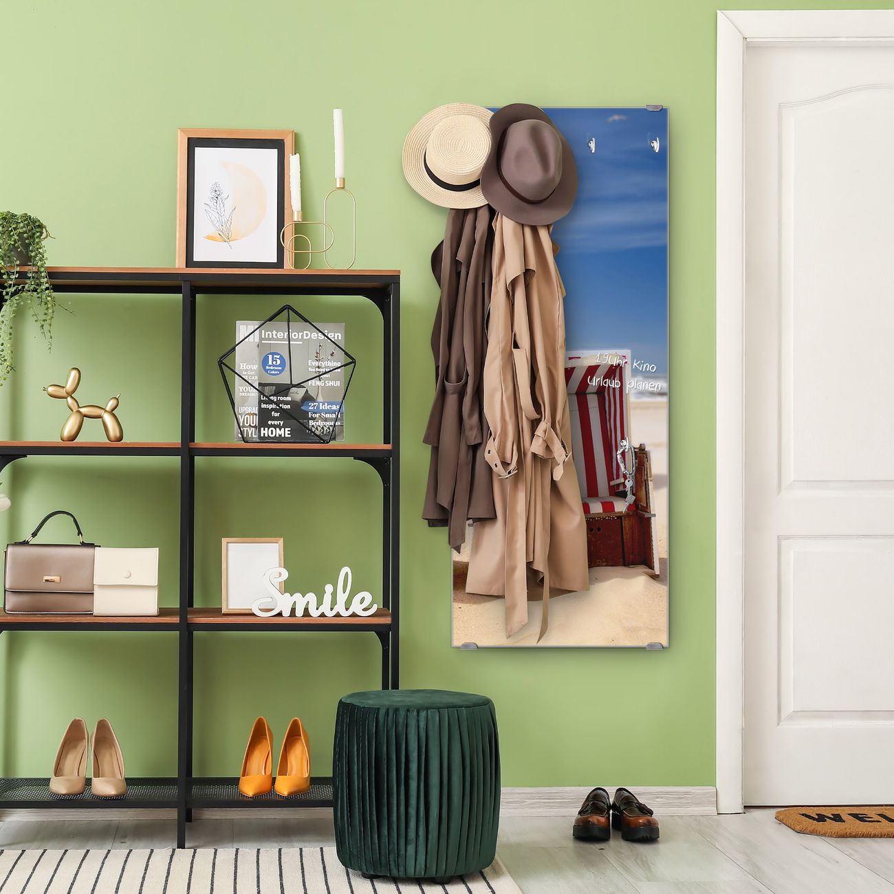 FUNKTION: Die banjado Wandgarderobe mit Motiv Strandkörbe ist Ihr täglicher Begleiter. Zuverlässig hängen hier Ihre Jacken und Mäntel griffbereit. Das Echtglas ist Ihr Paneel auch beschreibbar und wieder abwischbar. DESIGN: Sie erhalten eine Garderobenleiste aus elegantem Echtglas mit dem Farbbrillanten Motiv Strandkörbe hinterklebt. Das Design ist zeitlos klassisch, ohne dabei auf Funktionalität zu verzichten. Suchen Sie aus einer Vielzahl von Motiven das für Ihre Einrichtung Passende aus. DETAILS: Die Flurgarderobe besteht aus 4mm gehärtetem Sicherheitsglas. Sie ist 50cm breit, 125cm hoch und 6cm tief. Die Garderobenhaken zur Selbstmontage präsentieren sich in Edelstahl-Optik, ebenso die Abstandshalter für die Wandmontage. Ihre neue Garderobe ist sofort einsatzbereit. NUTZEN: Ihre neue Garderobe hält nicht nur zuverlässig Ihre Kleidung, sie ist auch optisch ein Blickfang. Durch das Glas können Sie an der Garderobe mit wasserlöslichen Kreidestiften oder Whiteboard-Markern auch Nachrichten hinterlassen. BANJADO: Wir sind ein kleines kreatives Team aus Sachsen und entwickeln Produkte die Design und Funktionalität verbinden sollen. Viel Freude mit Ihrer neuen Garderobe wünscht das banjado-Team!