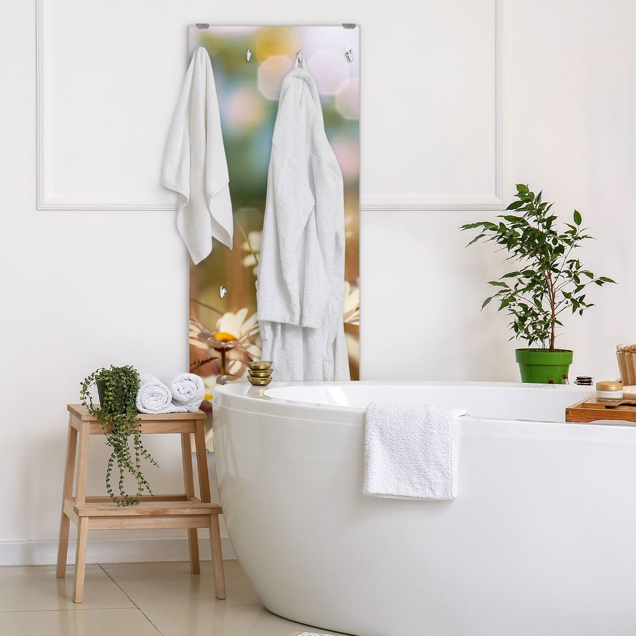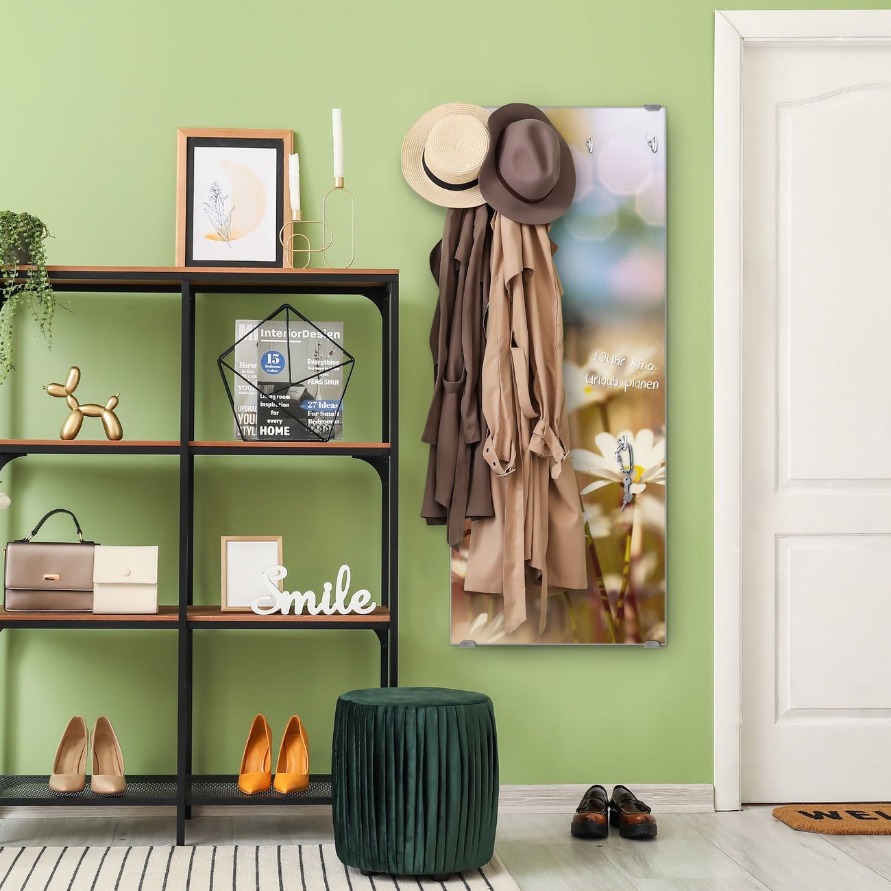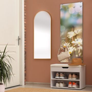 FUNKTION: Die banjado Wandgarderobe mit Motiv Tausendschönwiese ist Ihr täglicher Begleiter. Zuverlässig hängen hier Ihre Jacken und Mäntel griffbereit. Das Echtglas ist Ihr Paneel auch beschreibbar und wieder abwischbar. DESIGN: Sie erhalten eine Garderobenleiste aus elegantem Echtglas mit dem Farbbrillanten Motiv Tausendschönwiese hinterklebt. Das Design ist zeitlos klassisch, ohne dabei auf Funktionalität zu verzichten. Suchen Sie aus einer Vielzahl von Motiven das für Ihre Einrichtung Passende aus. DETAILS: Die Flurgarderobe besteht aus 4mm gehärtetem Sicherheitsglas. Sie ist 50cm breit, 125cm hoch und 6cm tief. Die Garderobenhaken zur Selbstmontage präsentieren sich in Edelstahl-Optik, ebenso die Abstandshalter für die Wandmontage. Ihre neue Garderobe ist sofort einsatzbereit. NUTZEN: Ihre neue Garderobe hält nicht nur zuverlässig Ihre Kleidung, sie ist auch optisch ein Blickfang. Durch das Glas können Sie an der Garderobe mit wasserlöslichen Kreidestiften oder Whiteboard-Markern auch Nachrichten hinterlassen. BANJADO: Wir sind ein kleines kreatives Team aus Sachsen und entwickeln Produkte die Design und Funktionalität verbinden sollen. Viel Freude mit Ihrer neuen Garderobe wünscht das banjado-Team!