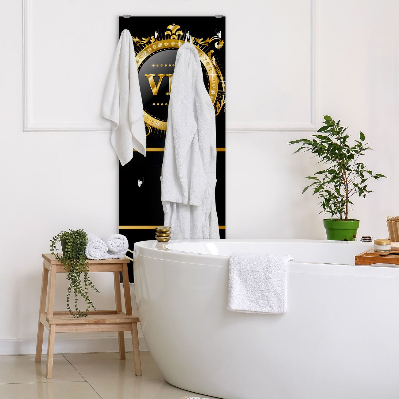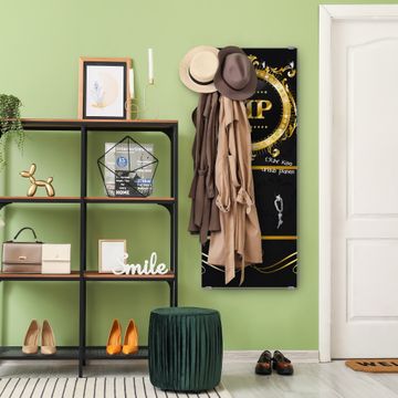 FUNKTION: Die banjado Wandgarderobe mit Motiv VIP ist Ihr täglicher Begleiter. Zuverlässig hängen hier Ihre Jacken und Mäntel griffbereit. Das Echtglas ist Ihr Paneel auch beschreibbar und wieder abwischbar. DESIGN: Sie erhalten eine Garderobenleiste aus elegantem Echtglas mit dem Farbbrillanten Motiv VIP hinterklebt. Das Design ist zeitlos klassisch, ohne dabei auf Funktionalität zu verzichten. Suchen Sie aus einer Vielzahl von Motiven das für Ihre Einrichtung Passende aus. DETAILS: Die Flurgarderobe besteht aus 4mm gehärtetem Sicherheitsglas. Sie ist 50cm breit, 125cm hoch und 6cm tief. Die Garderobenhaken zur Selbstmontage präsentieren sich in Edelstahl-Optik, ebenso die Abstandshalter für die Wandmontage. Ihre neue Garderobe ist sofort einsatzbereit. NUTZEN: Ihre neue Garderobe hält nicht nur zuverlässig Ihre Kleidung, sie ist auch optisch ein Blickfang. Durch das Glas können Sie an der Garderobe mit wasserlöslichen Kreidestiften oder Whiteboard-Markern auch Nachrichten hinterlassen. BANJADO: Wir sind ein kleines kreatives Team aus Sachsen und entwickeln Produkte die Design und Funktionalität verbinden sollen. Viel Freude mit Ihrer neuen Garderobe wünscht das banjado-Team!
