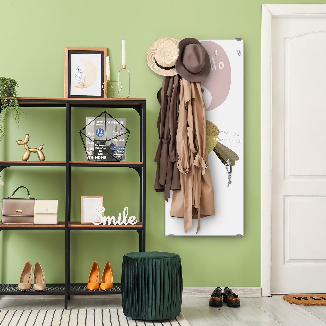 FUNKTION: Die banjado Wandgarderobe mit Motiv Vogel mit Sprechblase ist Ihr täglicher Begleiter. Zuverlässig hängen hier Ihre Jacken und Mäntel griffbereit. Das Echtglas ist Ihr Paneel auch beschreibbar und wieder abwischbar. DESIGN: Sie erhalten eine Garderobenleiste aus elegantem Echtglas mit dem Farbbrillanten Motiv Vogel mit Sprechblase hinterklebt. Das Design ist zeitlos klassisch, ohne dabei auf Funktionalität zu verzichten. Suchen Sie aus einer Vielzahl von Motiven das für Ihre Einrichtung Passende aus. DETAILS: Die Flurgarderobe besteht aus 4mm gehärtetem Sicherheitsglas. Sie ist 50cm breit, 125cm hoch und 6cm tief. Die Garderobenhaken zur Selbstmontage präsentieren sich in Edelstahl-Optik, ebenso die Abstandshalter für die Wandmontage. Ihre neue Garderobe ist sofort einsatzbereit. NUTZEN: Ihre neue Garderobe hält nicht nur zuverlässig Ihre Kleidung, sie ist auch optisch ein Blickfang. Durch das Glas können Sie an der Garderobe mit wasserlöslichen Kreidestiften oder Whiteboard-Markern auch Nachrichten hinterlassen. BANJADO: Wir sind ein kleines kreatives Team aus Sachsen und entwickeln Produkte die Design und Funktionalität verbinden sollen. Viel Freude mit Ihrer neuen Garderobe wünscht das banjado-Team!