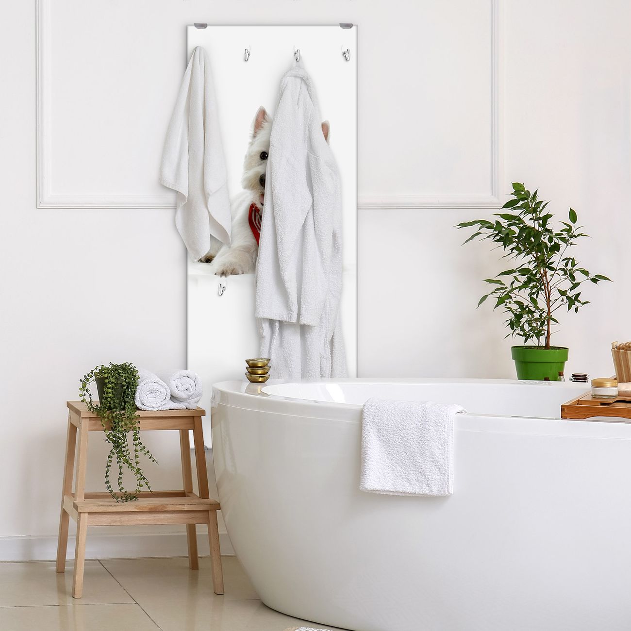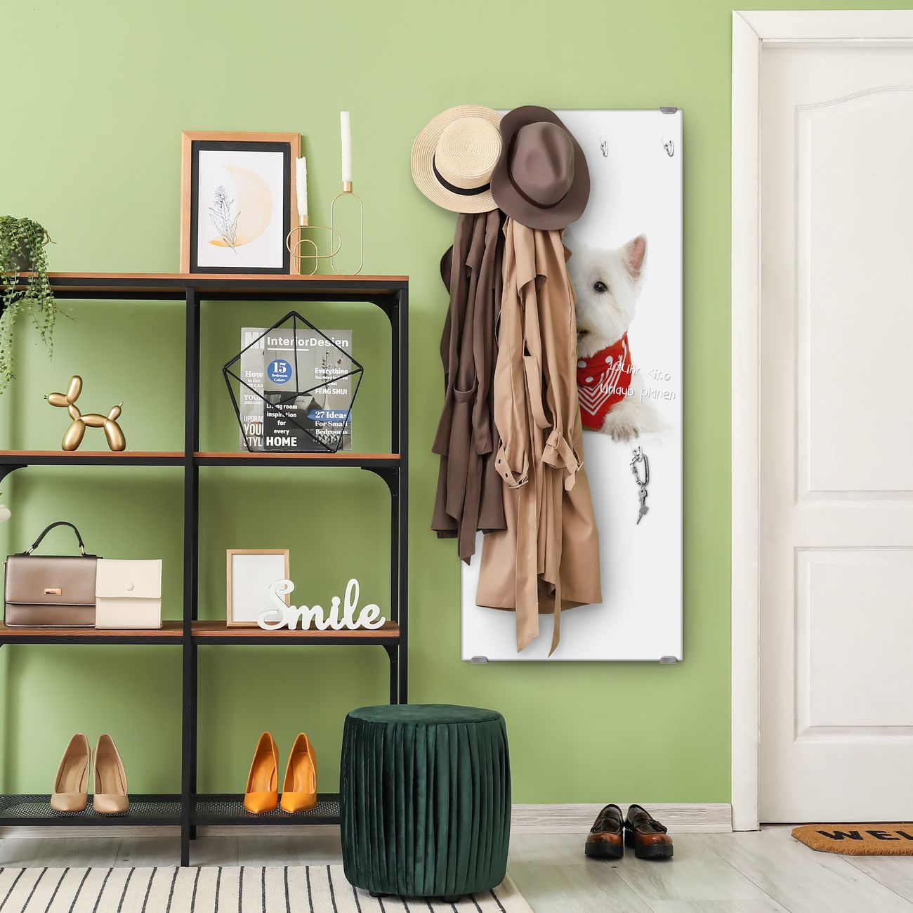 FUNKTION: Die banjado Wandgarderobe mit Motiv Westie ist Ihr täglicher Begleiter. Zuverlässig hängen hier Ihre Jacken und Mäntel griffbereit. Das Echtglas ist Ihr Paneel auch beschreibbar und wieder abwischbar. DESIGN: Sie erhalten eine Garderobenleiste aus elegantem Echtglas mit dem Farbbrillanten Motiv Westie hinterklebt. Das Design ist zeitlos klassisch, ohne dabei auf Funktionalität zu verzichten. Suchen Sie aus einer Vielzahl von Motiven das für Ihre Einrichtung Passende aus. DETAILS: Die Flurgarderobe besteht aus 4mm gehärtetem Sicherheitsglas. Sie ist 50cm breit, 125cm hoch und 6cm tief. Die Garderobenhaken zur Selbstmontage präsentieren sich in Edelstahl-Optik, ebenso die Abstandshalter für die Wandmontage. Ihre neue Garderobe ist sofort einsatzbereit. NUTZEN: Ihre neue Garderobe hält nicht nur zuverlässig Ihre Kleidung, sie ist auch optisch ein Blickfang. Durch das Glas können Sie an der Garderobe mit wasserlöslichen Kreidestiften oder Whiteboard-Markern auch Nachrichten hinterlassen. BANJADO: Wir sind ein kleines kreatives Team aus Sachsen und entwickeln Produkte die Design und Funktionalität verbinden sollen. Viel Freude mit Ihrer neuen Garderobe wünscht das banjado-Team!