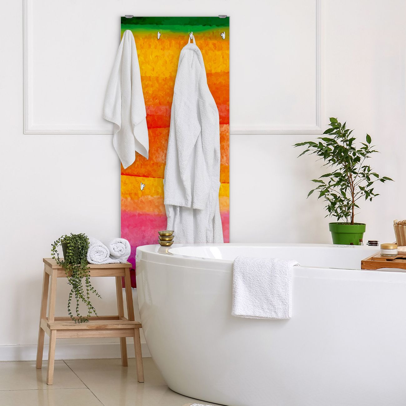 FUNKTION: Die banjado Wandgarderobe mit Motiv Aquarell ist Ihr täglicher Begleiter. Zuverlässig hängen hier Ihre Jacken und Mäntel griffbereit. Das Echtglas ist Ihr Paneel auch beschreibbar und wieder abwischbar. DESIGN: Sie erhalten eine Garderobenleiste aus elegantem Echtglas mit dem Farbbrillanten Motiv Aquarell hinterklebt. Das Design ist zeitlos klassisch, ohne dabei auf Funktionalität zu verzichten. Suchen Sie aus einer Vielzahl von Motiven das für Ihre Einrichtung Passende aus. DETAILS: Die Flurgarderobe besteht aus 4mm gehärtetem Sicherheitsglas. Sie ist 50cm breit, 125cm hoch und 6cm tief. Die Garderobenhaken zur Selbstmontage präsentieren sich in Edelstahl-Optik, ebenso die Abstandshalter für die Wandmontage. Ihre neue Garderobe ist sofort einsatzbereit. NUTZEN: Ihre neue Garderobe hält nicht nur zuverlässig Ihre Kleidung, sie ist auch optisch ein Blickfang. Durch das Glas können Sie an der Garderobe mit wasserlöslichen Kreidestiften oder Whiteboard-Markern auch Nachrichten hinterlassen. BANJADO: Wir sind ein kleines kreatives Team aus Sachsen und entwickeln Produkte die Design und Funktionalität verbinden sollen. Viel Freude mit Ihrer neuen Garderobe wünscht das banjado-Team!