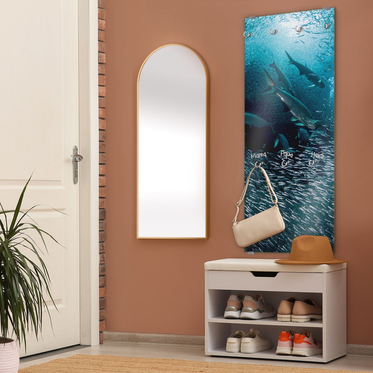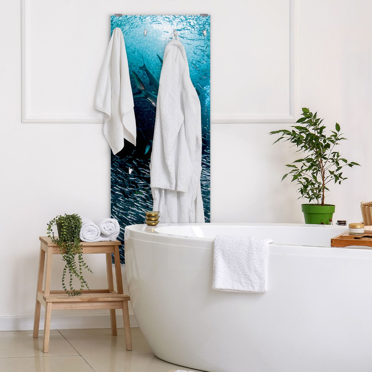 FUNKTION: Die banjado Wandgarderobe mit Motiv Fische im Meer ist Ihr täglicher Begleiter. Zuverlässig hängen hier Ihre Jacken und Mäntel griffbereit. Das Echtglas ist Ihr Paneel auch beschreibbar und wieder abwischbar. DESIGN: Sie erhalten eine Garderobenleiste aus elegantem Echtglas mit dem Farbbrillanten Motiv Fische im Meer hinterklebt. Das Design ist zeitlos klassisch, ohne dabei auf Funktionalität zu verzichten. Suchen Sie aus einer Vielzahl von Motiven das für Ihre Einrichtung Passende aus. DETAILS: Die Flurgarderobe besteht aus 4mm gehärtetem Sicherheitsglas. Sie ist 50cm breit, 125cm hoch und 6cm tief. Die Garderobenhaken zur Selbstmontage präsentieren sich in Edelstahl-Optik, ebenso die Abstandshalter für die Wandmontage. Ihre neue Garderobe ist sofort einsatzbereit. NUTZEN: Ihre neue Garderobe hält nicht nur zuverlässig Ihre Kleidung, sie ist auch optisch ein Blickfang. Durch das Glas können Sie an der Garderobe mit wasserlöslichen Kreidestiften oder Whiteboard-Markern auch Nachrichten hinterlassen. BANJADO: Wir sind ein kleines kreatives Team aus Sachsen und entwickeln Produkte die Design und Funktionalität verbinden sollen. Viel Freude mit Ihrer neuen Garderobe wünscht das banjado-Team!
