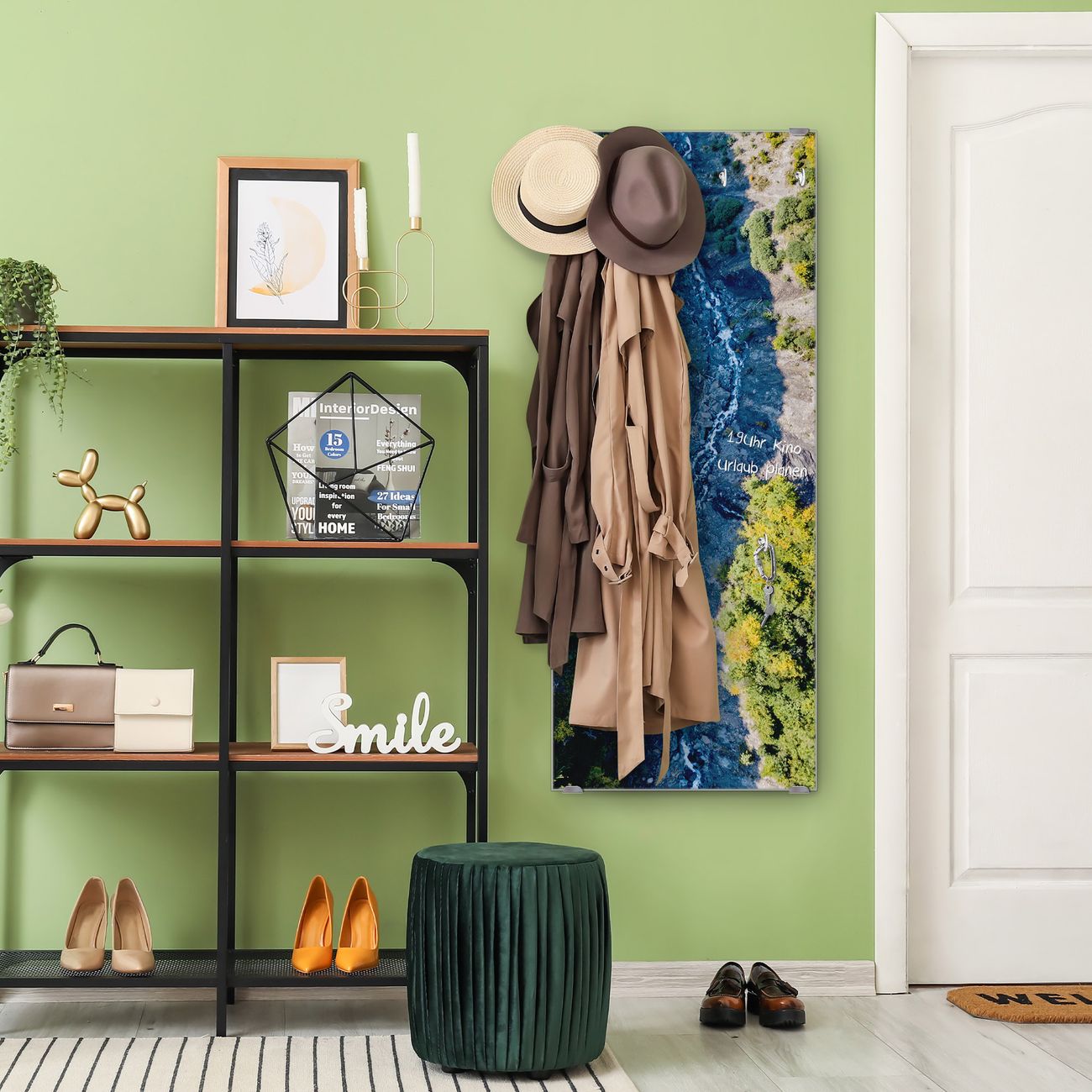 FUNKTION: Die banjado Wandgarderobe mit Motiv Fluss im Tal ist Ihr täglicher Begleiter. Zuverlässig hängen hier Ihre Jacken und Mäntel griffbereit. Das Echtglas ist Ihr Paneel auch beschreibbar und wieder abwischbar. DESIGN: Sie erhalten eine Garderobenleiste aus elegantem Echtglas mit dem Farbbrillanten Motiv Fluss im Tal hinterklebt. Das Design ist zeitlos klassisch, ohne dabei auf Funktionalität zu verzichten. Suchen Sie aus einer Vielzahl von Motiven das für Ihre Einrichtung Passende aus. DETAILS: Die Flurgarderobe besteht aus 4mm gehärtetem Sicherheitsglas. Sie ist 50cm breit, 125cm hoch und 6cm tief. Die Garderobenhaken zur Selbstmontage präsentieren sich in Edelstahl-Optik, ebenso die Abstandshalter für die Wandmontage. Ihre neue Garderobe ist sofort einsatzbereit. NUTZEN: Ihre neue Garderobe hält nicht nur zuverlässig Ihre Kleidung, sie ist auch optisch ein Blickfang. Durch das Glas können Sie an der Garderobe mit wasserlöslichen Kreidestiften oder Whiteboard-Markern auch Nachrichten hinterlassen. BANJADO: Wir sind ein kleines kreatives Team aus Sachsen und entwickeln Produkte die Design und Funktionalität verbinden sollen. Viel Freude mit Ihrer neuen Garderobe wünscht das banjado-Team!