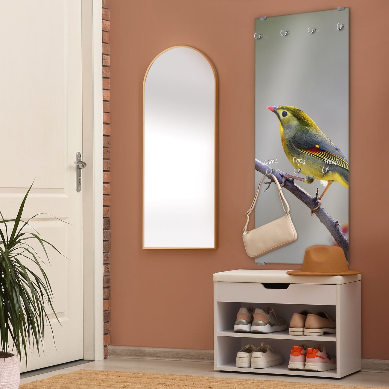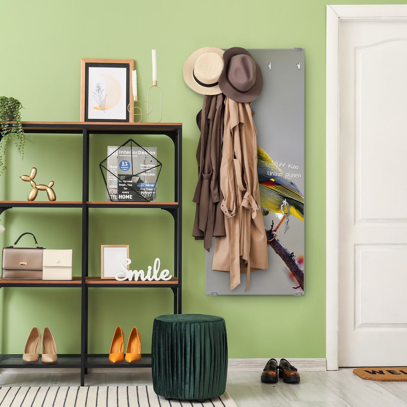 FUNKTION: Die banjado Wandgarderobe mit Motiv Herbst Vogel ist Ihr täglicher Begleiter. Zuverlässig hängen hier Ihre Jacken und Mäntel griffbereit. Das Echtglas ist Ihr Paneel auch beschreibbar und wieder abwischbar. DESIGN: Sie erhalten eine Garderobenleiste aus elegantem Echtglas mit dem Farbbrillanten Motiv Herbst Vogel hinterklebt. Das Design ist zeitlos klassisch, ohne dabei auf Funktionalität zu verzichten. Suchen Sie aus einer Vielzahl von Motiven das für Ihre Einrichtung Passende aus. DETAILS: Die Flurgarderobe besteht aus 4mm gehärtetem Sicherheitsglas. Sie ist 50cm breit, 125cm hoch und 6cm tief. Die Garderobenhaken zur Selbstmontage präsentieren sich in Edelstahl-Optik, ebenso die Abstandshalter für die Wandmontage. Ihre neue Garderobe ist sofort einsatzbereit. NUTZEN: Ihre neue Garderobe hält nicht nur zuverlässig Ihre Kleidung, sie ist auch optisch ein Blickfang. Durch das Glas können Sie an der Garderobe mit wasserlöslichen Kreidestiften oder Whiteboard-Markern auch Nachrichten hinterlassen. BANJADO: Wir sind ein kleines kreatives Team aus Sachsen und entwickeln Produkte die Design und Funktionalität verbinden sollen. Viel Freude mit Ihrer neuen Garderobe wünscht das banjado-Team!