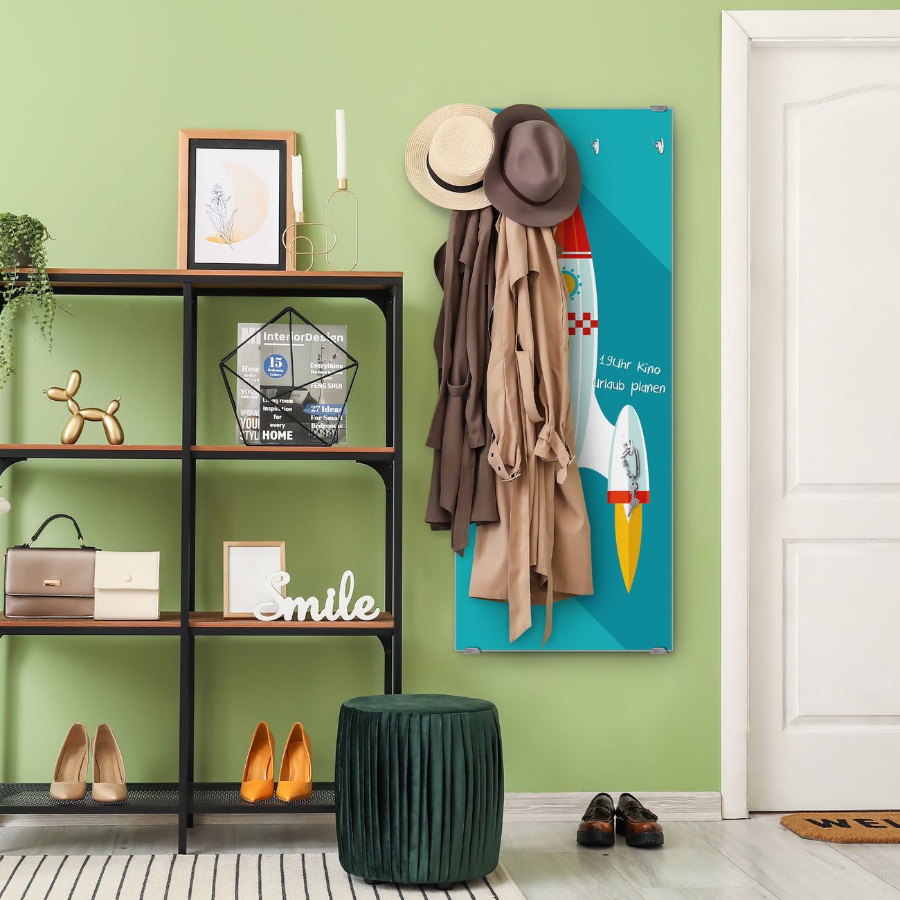 FUNKTION: Die banjado Wandgarderobe mit Motiv Rakete ist Ihr täglicher Begleiter. Zuverlässig hängen hier Ihre Jacken und Mäntel griffbereit. Das Echtglas ist Ihr Paneel auch beschreibbar und wieder abwischbar. DESIGN: Sie erhalten eine Garderobenleiste aus elegantem Echtglas mit dem Farbbrillanten Motiv Rakete hinterklebt. Das Design ist zeitlos klassisch, ohne dabei auf Funktionalität zu verzichten. Suchen Sie aus einer Vielzahl von Motiven das für Ihre Einrichtung Passende aus. DETAILS: Die Flurgarderobe besteht aus 4mm gehärtetem Sicherheitsglas. Sie ist 50cm breit, 125cm hoch und 6cm tief. Die Garderobenhaken zur Selbstmontage präsentieren sich in Edelstahl-Optik, ebenso die Abstandshalter für die Wandmontage. Ihre neue Garderobe ist sofort einsatzbereit. NUTZEN: Ihre neue Garderobe hält nicht nur zuverlässig Ihre Kleidung, sie ist auch optisch ein Blickfang. Durch das Glas können Sie an der Garderobe mit wasserlöslichen Kreidestiften oder Whiteboard-Markern auch Nachrichten hinterlassen. BANJADO: Wir sind ein kleines kreatives Team aus Sachsen und entwickeln Produkte die Design und Funktionalität verbinden sollen. Viel Freude mit Ihrer neuen Garderobe wünscht das banjado-Team!