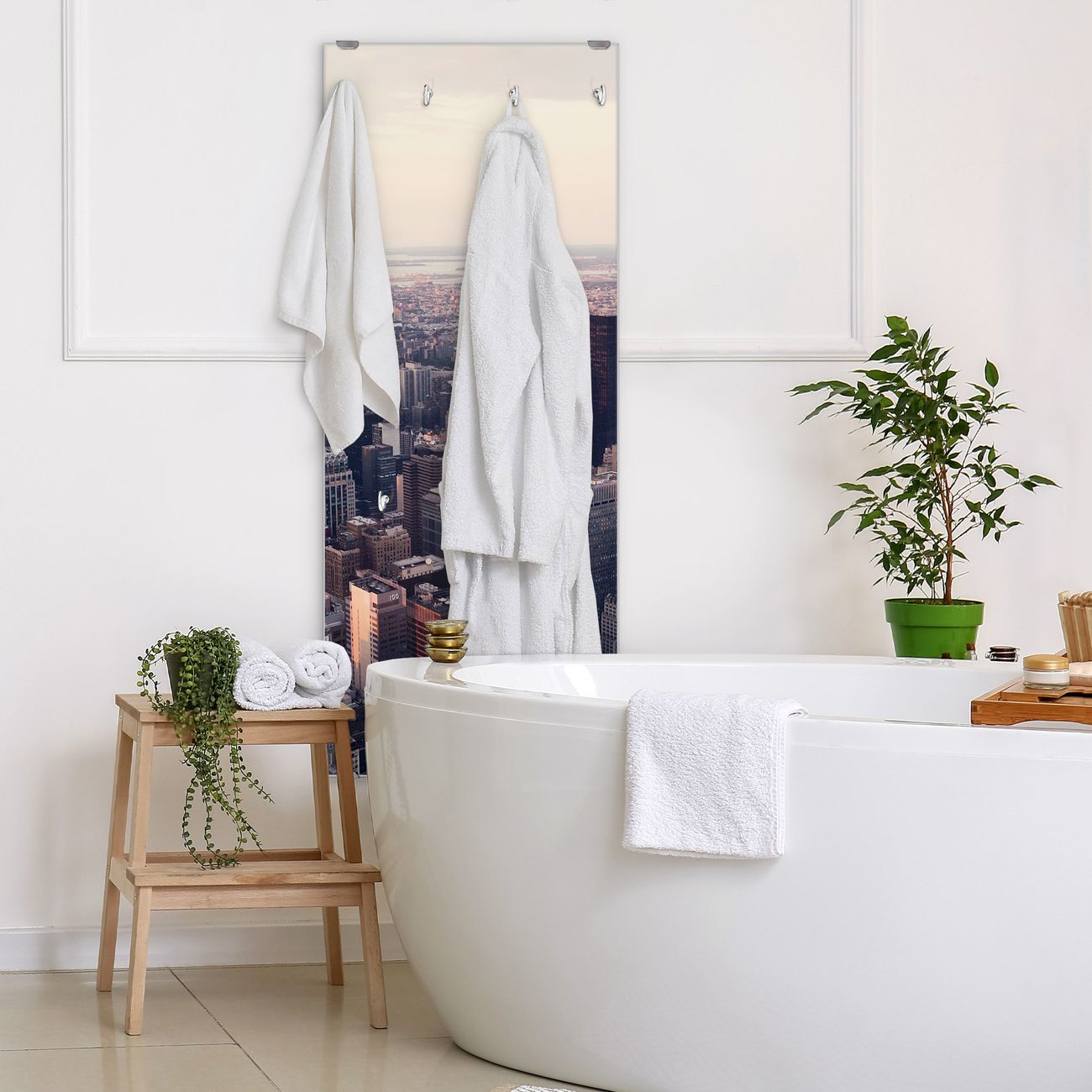FUNKTION: Die banjado Wandgarderobe mit Motiv Skyline ist Ihr täglicher Begleiter. Zuverlässig hängen hier Ihre Jacken und Mäntel griffbereit. Das Echtglas ist Ihr Paneel auch beschreibbar und wieder abwischbar. DESIGN: Sie erhalten eine Garderobenleiste aus elegantem Echtglas mit dem Farbbrillanten Motiv Skyline hinterklebt. Das Design ist zeitlos klassisch, ohne dabei auf Funktionalität zu verzichten. Suchen Sie aus einer Vielzahl von Motiven das für Ihre Einrichtung Passende aus. DETAILS: Die Flurgarderobe besteht aus 4mm gehärtetem Sicherheitsglas. Sie ist 50cm breit, 125cm hoch und 6cm tief. Die Garderobenhaken zur Selbstmontage präsentieren sich in Edelstahl-Optik, ebenso die Abstandshalter für die Wandmontage. Ihre neue Garderobe ist sofort einsatzbereit. NUTZEN: Ihre neue Garderobe hält nicht nur zuverlässig Ihre Kleidung, sie ist auch optisch ein Blickfang. Durch das Glas können Sie an der Garderobe mit wasserlöslichen Kreidestiften oder Whiteboard-Markern auch Nachrichten hinterlassen. BANJADO: Wir sind ein kleines kreatives Team aus Sachsen und entwickeln Produkte die Design und Funktionalität verbinden sollen. Viel Freude mit Ihrer neuen Garderobe wünscht das banjado-Team!