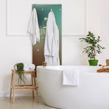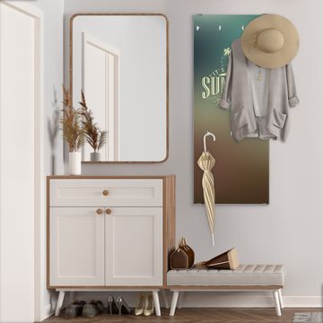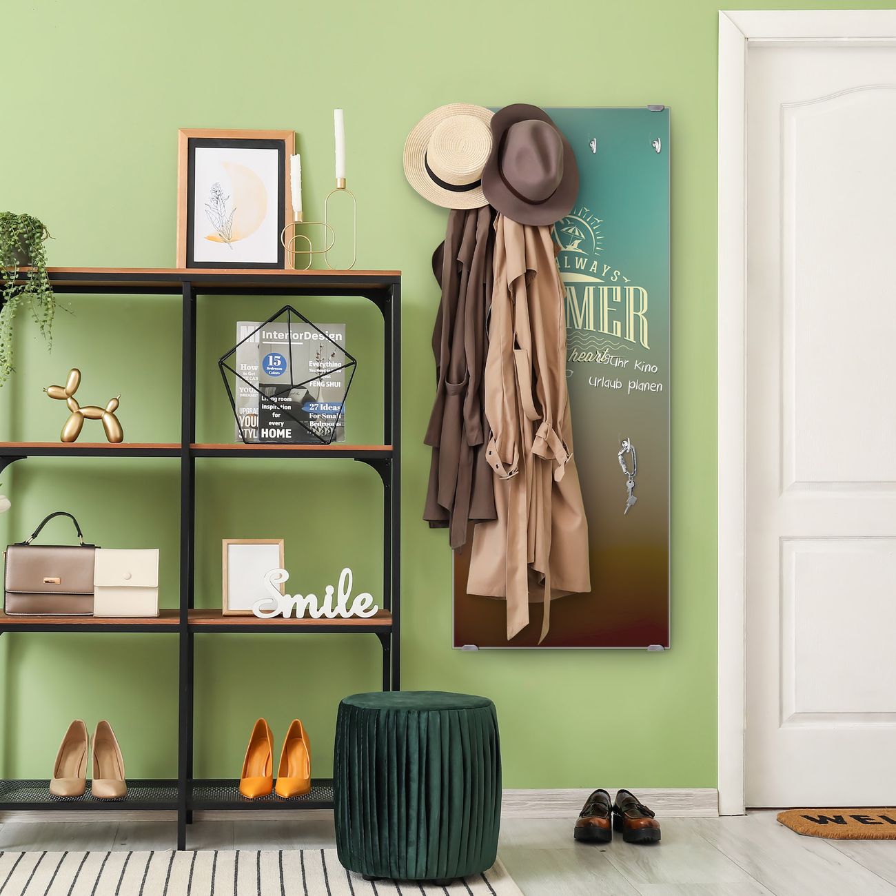 FUNKTION: Die banjado Wandgarderobe mit Motiv Sommer Heart ist Ihr täglicher Begleiter. Zuverlässig hängen hier Ihre Jacken und Mäntel griffbereit. Das Echtglas ist Ihr Paneel auch beschreibbar und wieder abwischbar. DESIGN: Sie erhalten eine Garderobenleiste aus elegantem Echtglas mit dem Farbbrillanten Motiv Sommer Heart hinterklebt. Das Design ist zeitlos klassisch, ohne dabei auf Funktionalität zu verzichten. Suchen Sie aus einer Vielzahl von Motiven das für Ihre Einrichtung Passende aus. DETAILS: Die Flurgarderobe besteht aus 4mm gehärtetem Sicherheitsglas. Sie ist 50cm breit, 125cm hoch und 6cm tief. Die Garderobenhaken zur Selbstmontage präsentieren sich in Edelstahl-Optik, ebenso die Abstandshalter für die Wandmontage. Ihre neue Garderobe ist sofort einsatzbereit. NUTZEN: Ihre neue Garderobe hält nicht nur zuverlässig Ihre Kleidung, sie ist auch optisch ein Blickfang. Durch das Glas können Sie an der Garderobe mit wasserlöslichen Kreidestiften oder Whiteboard-Markern auch Nachrichten hinterlassen. BANJADO: Wir sind ein kleines kreatives Team aus Sachsen und entwickeln Produkte die Design und Funktionalität verbinden sollen. Viel Freude mit Ihrer neuen Garderobe wünscht das banjado-Team!