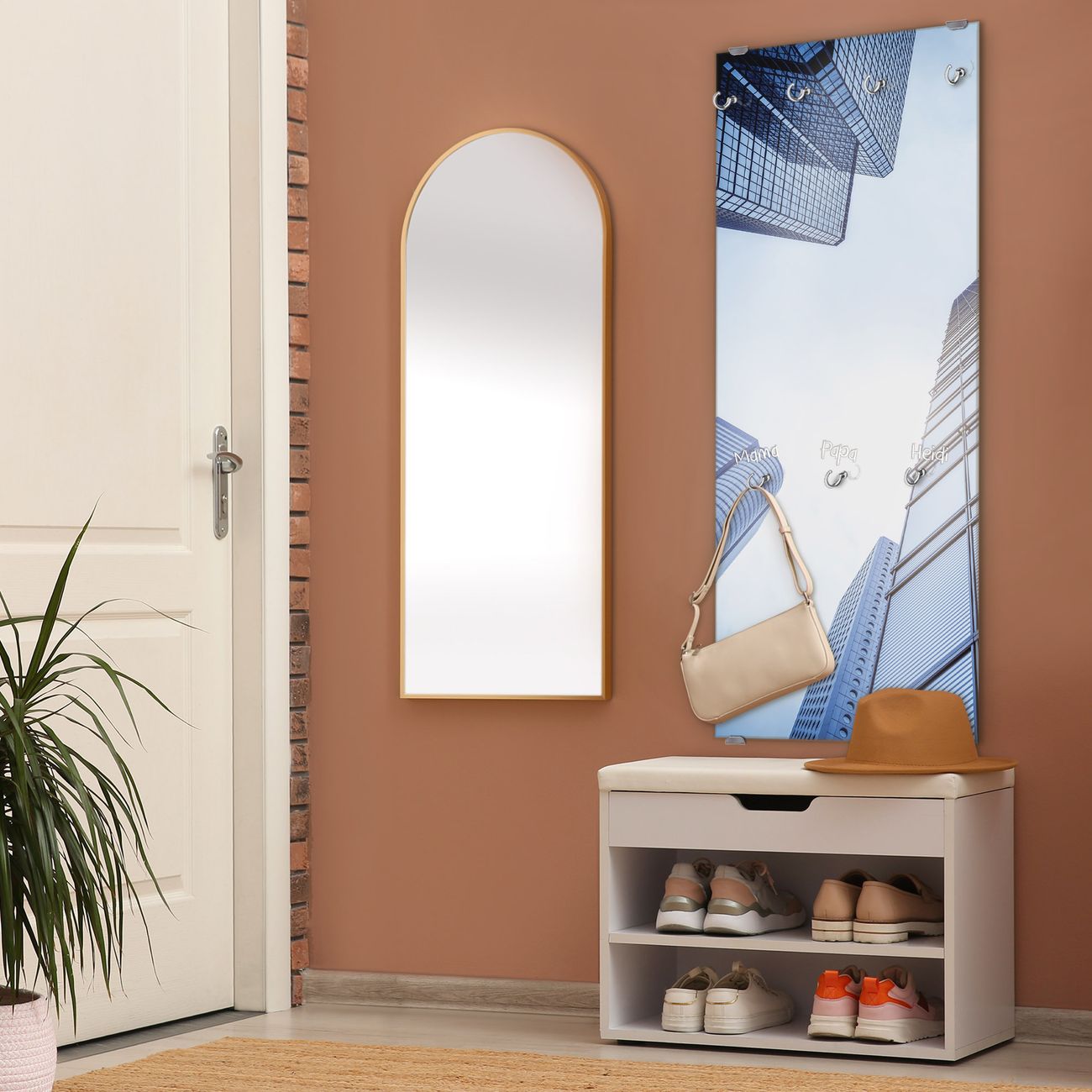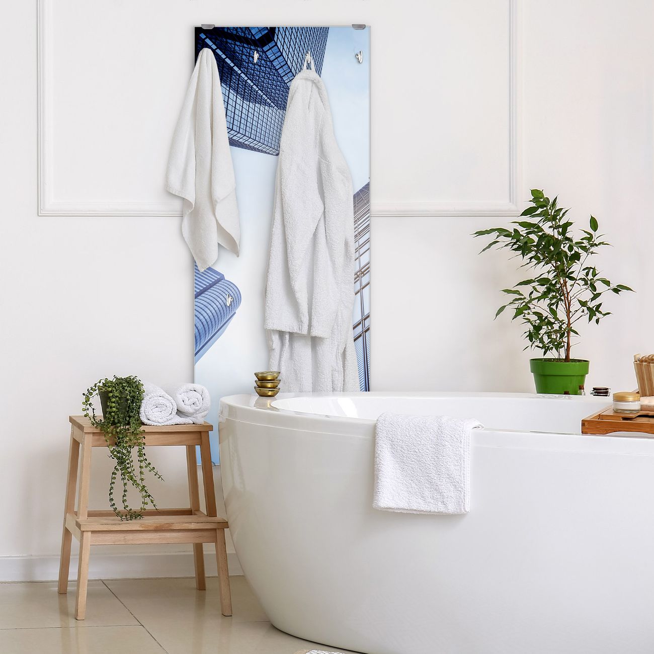 FUNKTION: Die banjado Wandgarderobe mit Motiv Wolkenkratzer ist Ihr täglicher Begleiter. Zuverlässig hängen hier Ihre Jacken und Mäntel griffbereit. Das Echtglas ist Ihr Paneel auch beschreibbar und wieder abwischbar. DESIGN: Sie erhalten eine Garderobenleiste aus elegantem Echtglas mit dem Farbbrillanten Motiv Wolkenkratzer hinterklebt. Das Design ist zeitlos klassisch, ohne dabei auf Funktionalität zu verzichten. Suchen Sie aus einer Vielzahl von Motiven das für Ihre Einrichtung Passende aus. DETAILS: Die Flurgarderobe besteht aus 4mm gehärtetem Sicherheitsglas. Sie ist 50cm breit, 125cm hoch und 6cm tief. Die Garderobenhaken zur Selbstmontage präsentieren sich in Edelstahl-Optik, ebenso die Abstandshalter für die Wandmontage. Ihre neue Garderobe ist sofort einsatzbereit. NUTZEN: Ihre neue Garderobe hält nicht nur zuverlässig Ihre Kleidung, sie ist auch optisch ein Blickfang. Durch das Glas können Sie an der Garderobe mit wasserlöslichen Kreidestiften oder Whiteboard-Markern auch Nachrichten hinterlassen. BANJADO: Wir sind ein kleines kreatives Team aus Sachsen und entwickeln Produkte die Design und Funktionalität verbinden sollen. Viel Freude mit Ihrer neuen Garderobe wünscht das banjado-Team!
