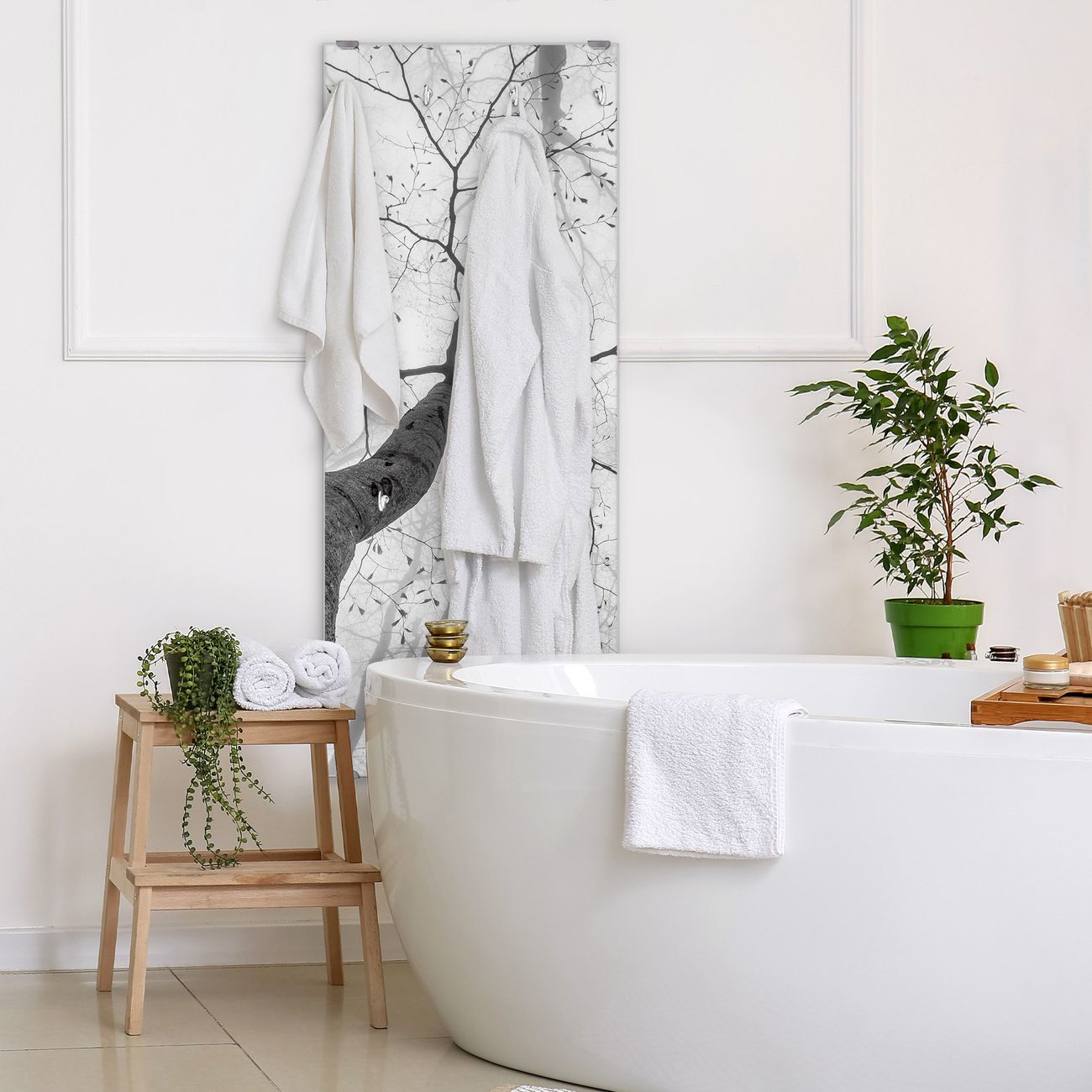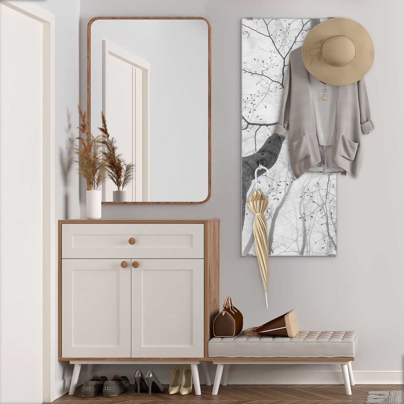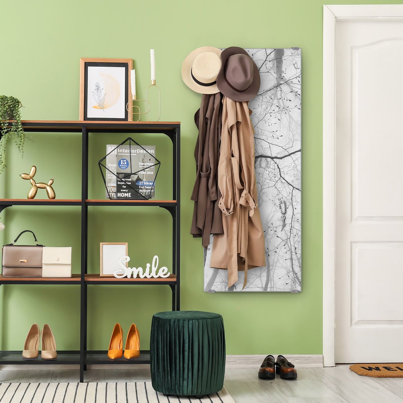 FUNKTION: Die banjado Wandgarderobe mit Motiv Zwischen Bäumen 6 ist Ihr täglicher Begleiter. Zuverlässig hängen hier Ihre Jacken und Mäntel griffbereit. Das Echtglas ist Ihr Paneel auch beschreibbar und wieder abwischbar. DESIGN: Sie erhalten eine Garderobenleiste aus elegantem Echtglas mit dem Farbbrillanten Motiv Zwischen Bäumen 6 hinterklebt. Das Design ist zeitlos klassisch, ohne dabei auf Funktionalität zu verzichten. Suchen Sie aus einer Vielzahl von Motiven das für Ihre Einrichtung Passende aus. DETAILS: Die Flurgarderobe besteht aus 4mm gehärtetem Sicherheitsglas. Sie ist 50cm breit, 125cm hoch und 6cm tief. Die Garderobenhaken zur Selbstmontage präsentieren sich in Edelstahl-Optik, ebenso die Abstandshalter für die Wandmontage. Ihre neue Garderobe ist sofort einsatzbereit. NUTZEN: Ihre neue Garderobe hält nicht nur zuverlässig Ihre Kleidung, sie ist auch optisch ein Blickfang. Durch das Glas können Sie an der Garderobe mit wasserlöslichen Kreidestiften oder Whiteboard-Markern auch Nachrichten hinterlassen. BANJADO: Wir sind ein kleines kreatives Team aus Sachsen und entwickeln Produkte die Design und Funktionalität verbinden sollen. Viel Freude mit Ihrer neuen Garderobe wünscht das banjado-Team!