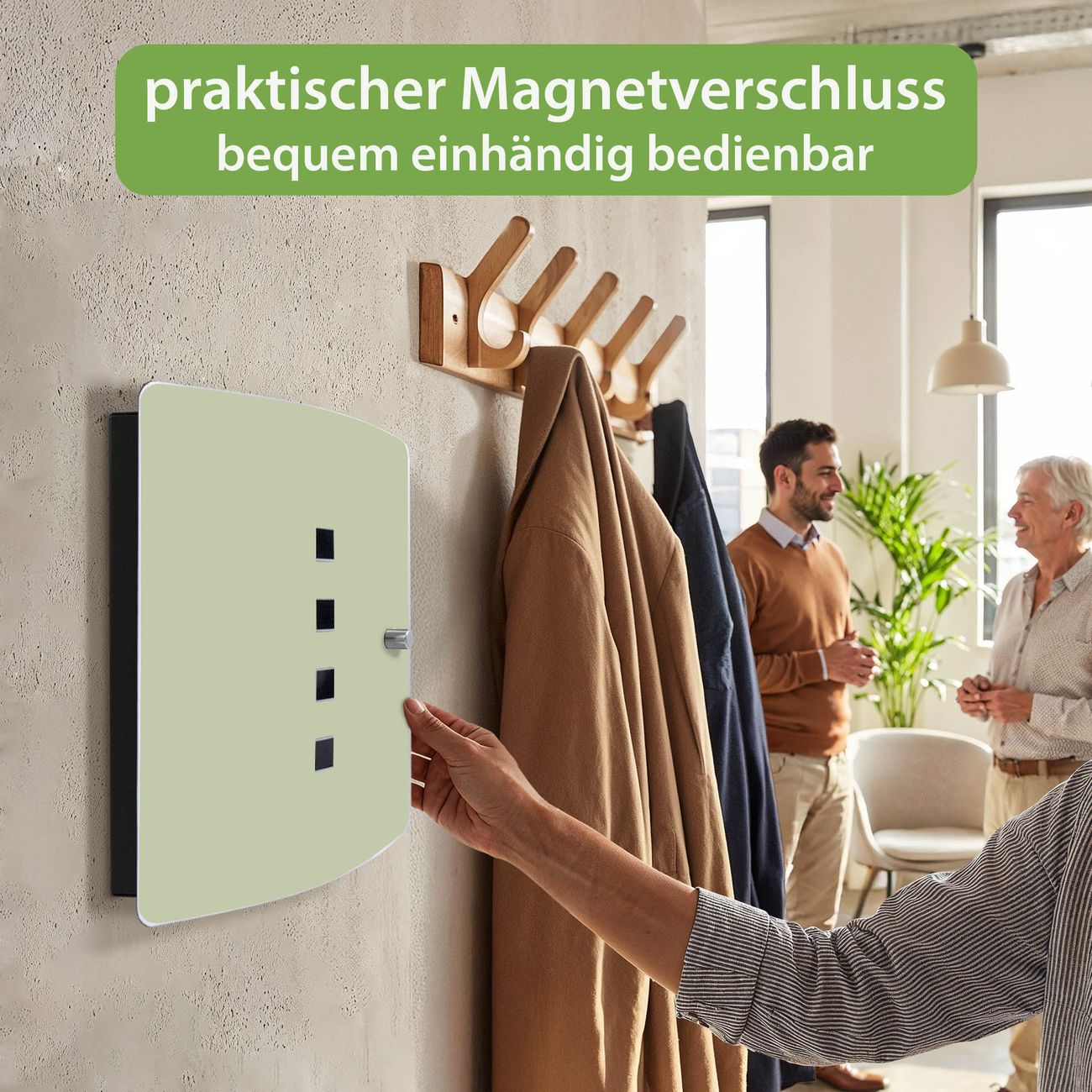 Funktion / Nutzen: Die leicht geschwungene Edelstahltür ist mit einer hochwertigen Motivfolie und dem Motiv Farbe Olive kaschiert. Ein praktischer Magnetverschluss ermöglicht Ihnen ein schnelles Öffnen und Schließen. Befestigt wird der Schlüsselkasten an 2 Stellen auf der Rückseite, passendes Montagematerial fügen wir bereits bei.