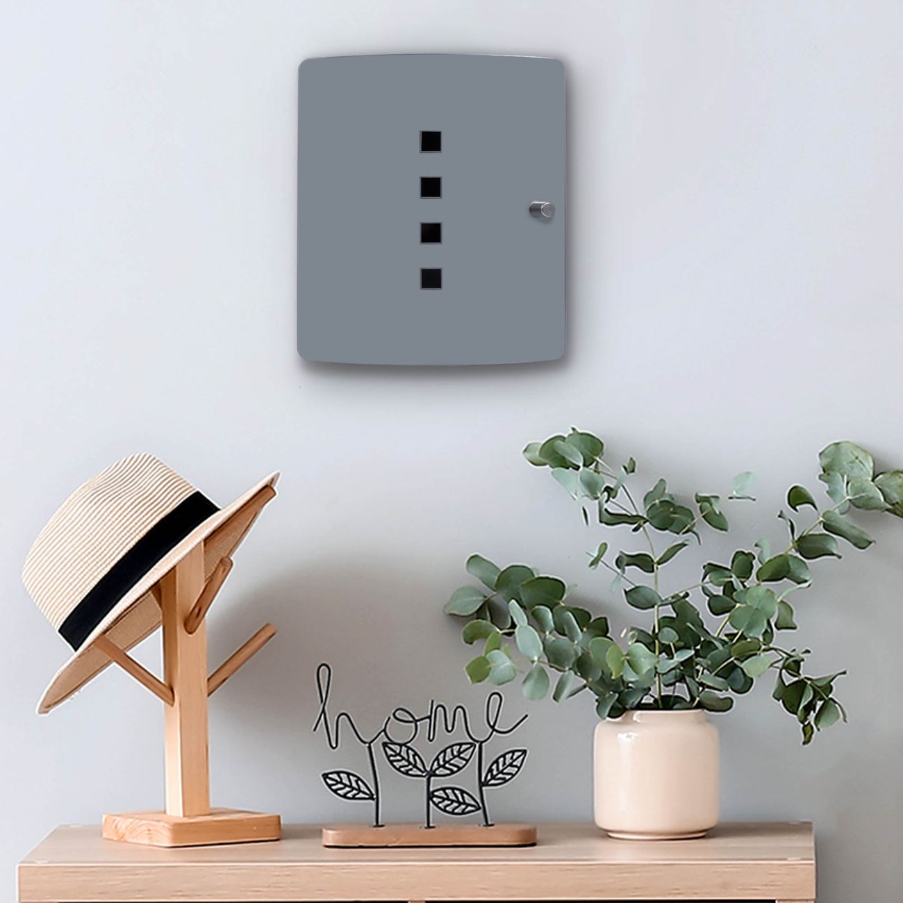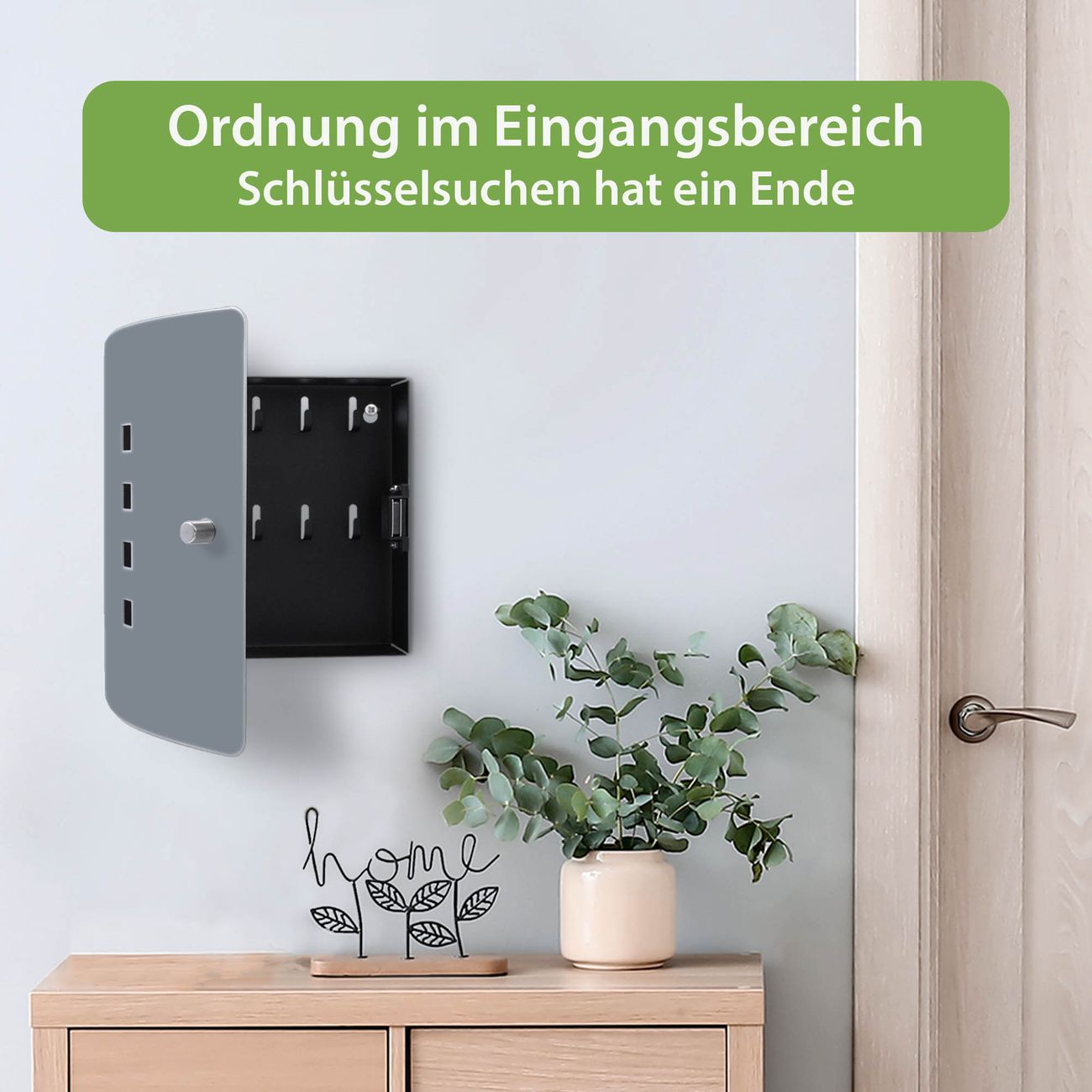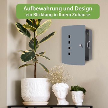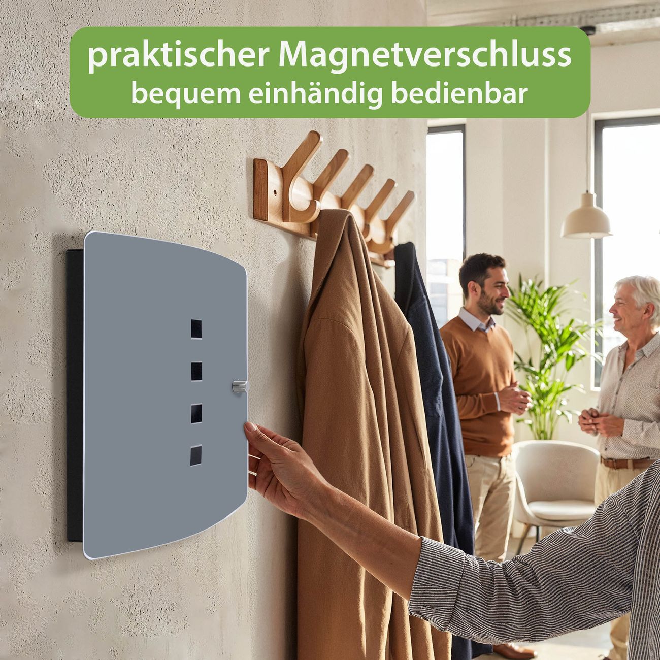 Funktion / Nutzen: Die leicht geschwungene Edelstahltür ist mit einer hochwertigen Motivfolie und dem Motiv Farbe Schiefergrau kaschiert. Ein praktischer Magnetverschluss ermöglicht Ihnen ein schnelles Öffnen und Schließen. Befestigt wird der Schlüsselkasten an 2 Stellen auf der Rückseite, passendes Montagematerial fügen wir bereits bei.