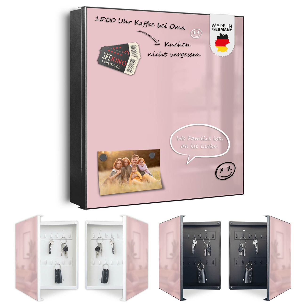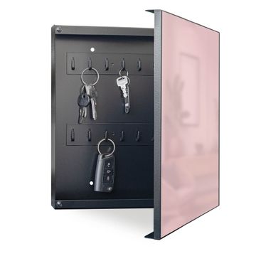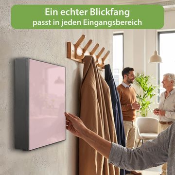 Bringe Ordnung und Eleganz in deinen Eingangsbereich mit dem banjado Schlüsselkasten Motiv Farbe Altrosa. Die moderne Schlüsselbox kombiniert funktionales Design mit hochwertiger Verarbeitung und wird so zu einem echten Hingucker in Flur, Büro oder Ferienwohnung. ✅ Stilvolle Schlüsselaufbewahrung mit Motiv Farbe Altrosa Der Design-Schlüsselkasten Motiv Farbe Altrosa bietet Platz für bis zu 32 Schlüssel, die auf 4 stabilen Reihen mit je 8 Haken übersichtlich verstaut werden. Mit seinen kompakten Maßen von 30 x 30 x 5 cm passt die Schlüsselbox perfekt auch in kleinere Räume. Der schwarz lackierte Stahlkorpus mit rechts angeschlagenem Türscharnier harmoniert mit gedruckten Folie auf der Front und fügt sich nahtlos in jedes Wohnambiente ein. Ob als Schlüsselorganizer für Zuhause oder als praktische Lösung für Büros, Praxen und Gewerbe, der banjado Schlüsselkasten sorgt für Ordnung und Übersicht. Dank der magnetischen, mit Kreidestiften beschreibbaren Folie auf der Front kannst du Notizen anheften oder Termine direkt auf der Oberfläche festhalten. Die Schlüsselbox Motiv Farbe Altrosa zur Wandmontage wird inklusive Befestigungsmaterial geliefert und ist schnell angebracht. So hast du deine Schlüssel jederzeit griffbereit und zugleich stilvoll verstaut. Mit diesem banjado Schlüsselkasten Motiv Farbe Altrosa kombinierst du praktische Aufbewahrung mit stilvollem Wohndesign. Ob privat oder geschäftlich, die Schlüsselbox sorgt für mehr Ordnung, Übersicht und ein wohnliches Ambiente.Vorteile im Überblick
