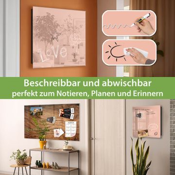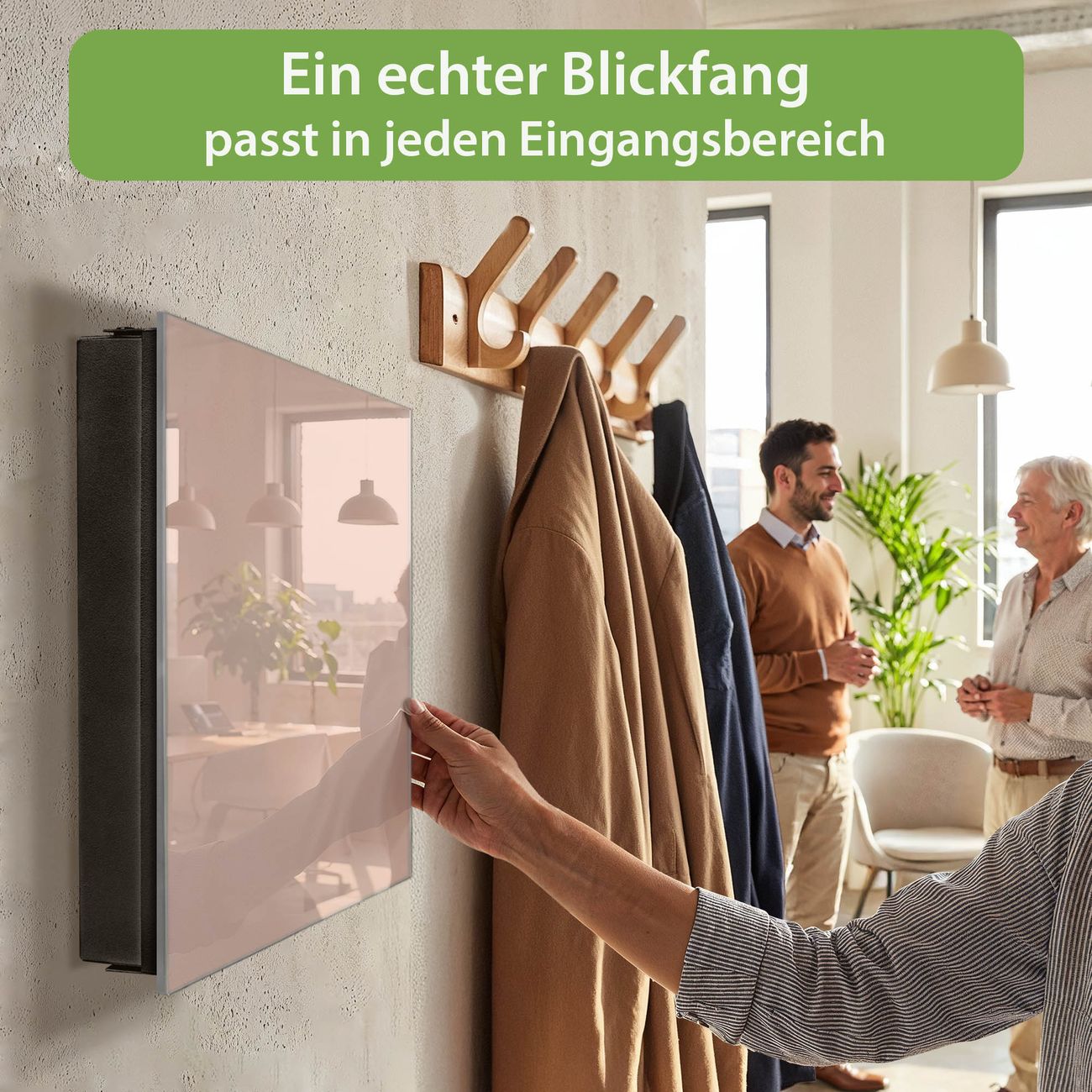 Bringe Ordnung und Eleganz in deinen Eingangsbereich mit dem banjado Schlüsselkasten Motiv Farbe Aprikot. Die moderne Schlüsselbox kombiniert funktionales Design mit hochwertiger Verarbeitung und wird so zu einem echten Hingucker in Flur, Büro oder Ferienwohnung. ✅ Stilvolle Schlüsselaufbewahrung mit Glasfront im Motiv Farbe Aprikot Der Design-Schlüsselkasten Motiv Farbe Aprikot bietet Platz für bis zu 50 Schlüssel, die auf 5 stabilen Reihen mit je 10 Haken übersichtlich verstaut werden. Mit seinen kompakten Maßen von 30 x 30 x 5 cm passt die Schlüsselbox perfekt auch in kleinere Räume. Der schwarz lackierte Stahlkorpus mit rechts angeschlagenem Türscharnier harmoniert mit der Glasfront und fügt sich nahtlos in jedes Wohnambiente ein. Ob als Schlüsselorganizer für Zuhause oder als praktische Lösung für Büros, Praxen und Gewerbe, der banjado Schlüsselkasten sorgt für Ordnung und Übersicht. Dank der magnetischen, mit Kreidestiften beschreibbaren Glasfront kannst du Notizen anheften oder Termine direkt auf der Oberfläche festhalten. Die Schlüsselbox Motiv Farbe Aprikot zur Wandmontage wird inklusive Befestigungsmaterial geliefert und ist schnell angebracht. So hast du deine Schlüssel jederzeit griffbereit und zugleich stilvoll verstaut. Mit diesem banjado Schlüsselkasten Motiv Farbe Aprikot kombinierst du praktische Aufbewahrung mit stilvollem Wohndesign. Ob privat oder geschäftlich, die Schlüsselbox sorgt für mehr Ordnung, Übersicht und ein wohnliches Ambiente.Vorteile im Überblick