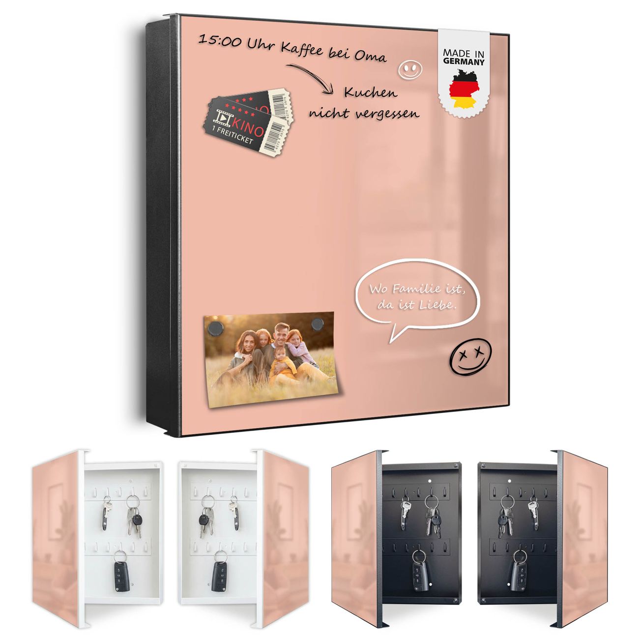 Bringe Ordnung und Eleganz in deinen Eingangsbereich mit dem banjado Schlüsselkasten Motiv Farbe Aprikot. Die moderne Schlüsselbox kombiniert funktionales Design mit hochwertiger Verarbeitung und wird so zu einem echten Hingucker in Flur, Büro oder Ferienwohnung. ✅ Stilvolle Schlüsselaufbewahrung mit Motiv Farbe Aprikot Der Design-Schlüsselkasten Motiv Farbe Aprikot bietet Platz für bis zu 32 Schlüssel, die auf 4 stabilen Reihen mit je 8 Haken übersichtlich verstaut werden. Mit seinen kompakten Maßen von 30 x 30 x 5 cm passt die Schlüsselbox perfekt auch in kleinere Räume. Der schwarz lackierte Stahlkorpus mit links angeschlagenem Türscharnier harmoniert mit gedruckten Folie auf der Front und fügt sich nahtlos in jedes Wohnambiente ein. Ob als Schlüsselorganizer für Zuhause oder als praktische Lösung für Büros, Praxen und Gewerbe, der banjado Schlüsselkasten sorgt für Ordnung und Übersicht. Dank der magnetischen, mit Kreidestiften beschreibbaren Folie auf der Front kannst du Notizen anheften oder Termine direkt auf der Oberfläche festhalten. Die Schlüsselbox Motiv Farbe Aprikot zur Wandmontage wird inklusive Befestigungsmaterial geliefert und ist schnell angebracht. So hast du deine Schlüssel jederzeit griffbereit und zugleich stilvoll verstaut. Mit diesem banjado Schlüsselkasten Motiv Farbe Aprikot kombinierst du praktische Aufbewahrung mit stilvollem Wohndesign. Ob privat oder geschäftlich, die Schlüsselbox sorgt für mehr Ordnung, Übersicht und ein wohnliches Ambiente.Vorteile im Überblick