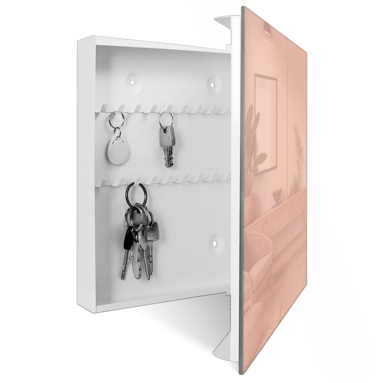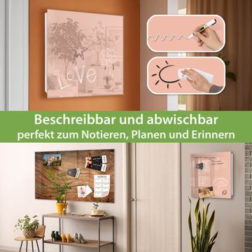 Bringe Ordnung und Eleganz in deinen Eingangsbereich mit dem banjado Schlüsselkasten Motiv Farbe Aprikot. Die moderne Schlüsselbox kombiniert funktionales Design mit hochwertiger Verarbeitung und wird so zu einem echten Hingucker in Flur, Büro oder Ferienwohnung. ✅ Stilvolle Schlüsselaufbewahrung mit Glasfront im Motiv Farbe Aprikot Der Design-Schlüsselkasten Motiv Farbe Aprikot bietet Platz für bis zu 50 Schlüssel, die auf 5 stabilen Reihen mit je 10 Haken übersichtlich verstaut werden. Mit seinen kompakten Maßen von 30 x 30 x 5 cm passt die Schlüsselbox perfekt auch in kleinere Räume. Der weiß lackierte Stahlkorpus mit rechts angeschlagenem Türscharnier harmoniert mit der Glasfront und fügt sich nahtlos in jedes Wohnambiente ein. Ob als Schlüsselorganizer für Zuhause oder als praktische Lösung für Büros, Praxen und Gewerbe, der banjado Schlüsselkasten sorgt für Ordnung und Übersicht. Dank der magnetischen, mit Kreidestiften beschreibbaren Glasfront kannst du Notizen anheften oder Termine direkt auf der Oberfläche festhalten. Die Schlüsselbox Motiv Farbe Aprikot zur Wandmontage wird inklusive Befestigungsmaterial geliefert und ist schnell angebracht. So hast du deine Schlüssel jederzeit griffbereit und zugleich stilvoll verstaut. Mit diesem banjado Schlüsselkasten Motiv Farbe Aprikot kombinierst du praktische Aufbewahrung mit stilvollem Wohndesign. Ob privat oder geschäftlich, die Schlüsselbox sorgt für mehr Ordnung, Übersicht und ein wohnliches Ambiente.Vorteile im Überblick