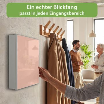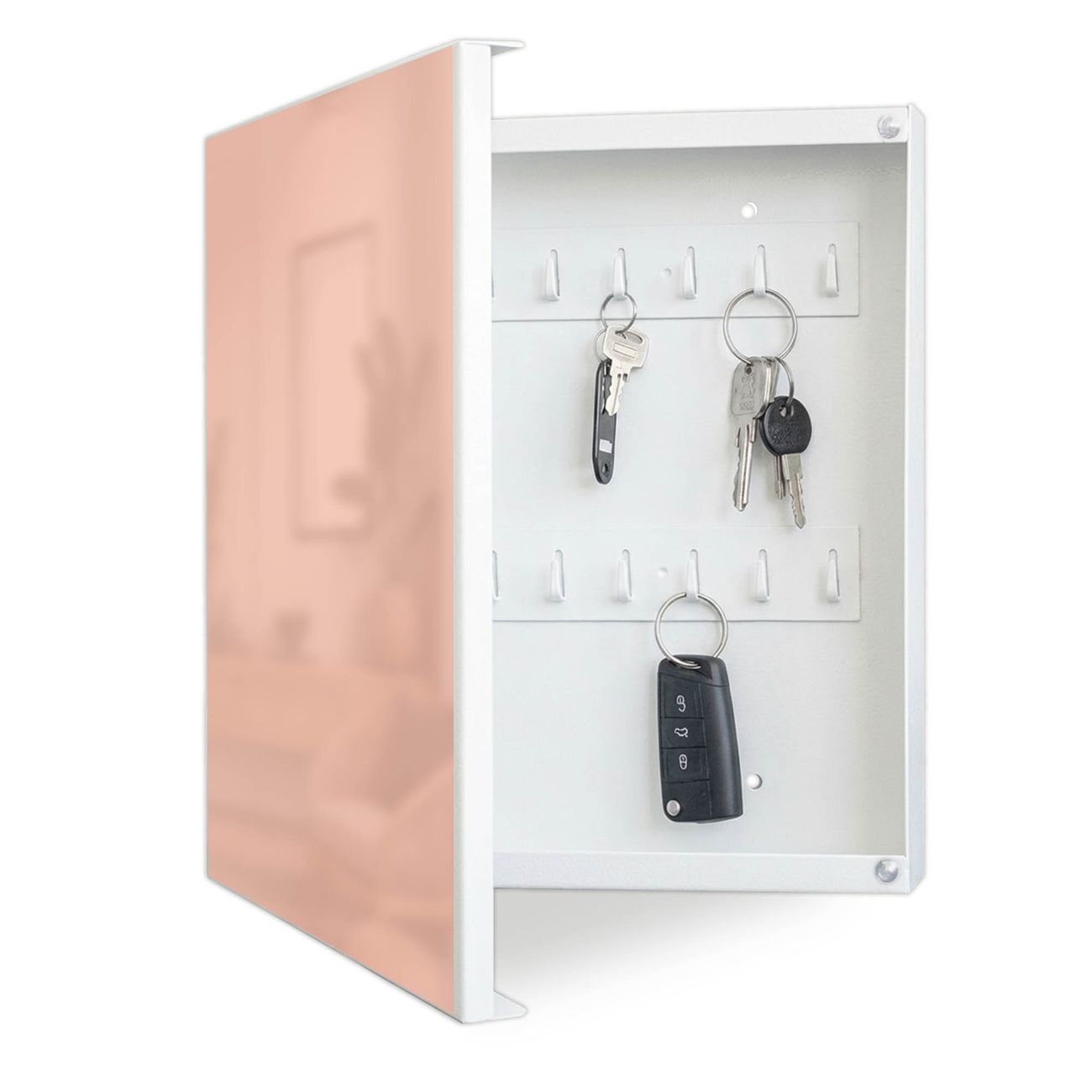 Bringe Ordnung und Eleganz in deinen Eingangsbereich mit dem banjado Schlüsselkasten Motiv Farbe Aprikot. Die moderne Schlüsselbox kombiniert funktionales Design mit hochwertiger Verarbeitung und wird so zu einem echten Hingucker in Flur, Büro oder Ferienwohnung. ✅ Stilvolle Schlüsselaufbewahrung mit Motiv Farbe Aprikot Der Design-Schlüsselkasten Motiv Farbe Aprikot bietet Platz für bis zu 32 Schlüssel, die auf 4 stabilen Reihen mit je 8 Haken übersichtlich verstaut werden. Mit seinen kompakten Maßen von 30 x 30 x 5 cm passt die Schlüsselbox perfekt auch in kleinere Räume. Der weiß lackierte Stahlkorpus mit links angeschlagenem Türscharnier harmoniert mit gedruckten Folie auf der Front und fügt sich nahtlos in jedes Wohnambiente ein. Ob als Schlüsselorganizer für Zuhause oder als praktische Lösung für Büros, Praxen und Gewerbe, der banjado Schlüsselkasten sorgt für Ordnung und Übersicht. Dank der magnetischen, mit Kreidestiften beschreibbaren Folie auf der Front kannst du Notizen anheften oder Termine direkt auf der Oberfläche festhalten. Die Schlüsselbox Motiv Farbe Aprikot zur Wandmontage wird inklusive Befestigungsmaterial geliefert und ist schnell angebracht. So hast du deine Schlüssel jederzeit griffbereit und zugleich stilvoll verstaut. Mit diesem banjado Schlüsselkasten Motiv Farbe Aprikot kombinierst du praktische Aufbewahrung mit stilvollem Wohndesign. Ob privat oder geschäftlich, die Schlüsselbox sorgt für mehr Ordnung, Übersicht und ein wohnliches Ambiente.Vorteile im Überblick