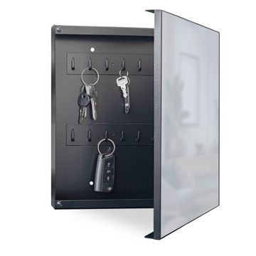 Bringe Ordnung und Eleganz in deinen Eingangsbereich mit dem banjado Schlüsselkasten Motiv Farbe Eisblau. Die moderne Schlüsselbox kombiniert funktionales Design mit hochwertiger Verarbeitung und wird so zu einem echten Hingucker in Flur, Büro oder Ferienwohnung. ✅ Stilvolle Schlüsselaufbewahrung mit Motiv Farbe Eisblau Der Design-Schlüsselkasten Motiv Farbe Eisblau bietet Platz für bis zu 32 Schlüssel, die auf 4 stabilen Reihen mit je 8 Haken übersichtlich verstaut werden. Mit seinen kompakten Maßen von 30 x 30 x 5 cm passt die Schlüsselbox perfekt auch in kleinere Räume. Der schwarz lackierte Stahlkorpus mit rechts angeschlagenem Türscharnier harmoniert mit gedruckten Folie auf der Front und fügt sich nahtlos in jedes Wohnambiente ein. Ob als Schlüsselorganizer für Zuhause oder als praktische Lösung für Büros, Praxen und Gewerbe, der banjado Schlüsselkasten sorgt für Ordnung und Übersicht. Dank der magnetischen, mit Kreidestiften beschreibbaren Folie auf der Front kannst du Notizen anheften oder Termine direkt auf der Oberfläche festhalten. Die Schlüsselbox Motiv Farbe Eisblau zur Wandmontage wird inklusive Befestigungsmaterial geliefert und ist schnell angebracht. So hast du deine Schlüssel jederzeit griffbereit und zugleich stilvoll verstaut. Mit diesem banjado Schlüsselkasten Motiv Farbe Eisblau kombinierst du praktische Aufbewahrung mit stilvollem Wohndesign. Ob privat oder geschäftlich, die Schlüsselbox sorgt für mehr Ordnung, Übersicht und ein wohnliches Ambiente.Vorteile im Überblick