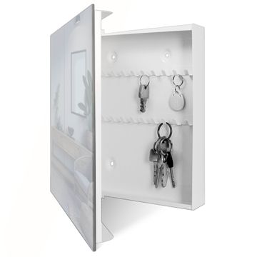 Bringe Ordnung und Eleganz in deinen Eingangsbereich mit dem banjado Schlüsselkasten Motiv Farbe Eisblau. Die moderne Schlüsselbox kombiniert funktionales Design mit hochwertiger Verarbeitung und wird so zu einem echten Hingucker in Flur, Büro oder Ferienwohnung. ✅ Stilvolle Schlüsselaufbewahrung mit Glasfront im Motiv Farbe Eisblau Der Design-Schlüsselkasten Motiv Farbe Eisblau bietet Platz für bis zu 50 Schlüssel, die auf 5 stabilen Reihen mit je 10 Haken übersichtlich verstaut werden. Mit seinen kompakten Maßen von 30 x 30 x 5 cm passt die Schlüsselbox perfekt auch in kleinere Räume. Der weiß lackierte Stahlkorpus mit rechts angeschlagenem Türscharnier harmoniert mit der Glasfront und fügt sich nahtlos in jedes Wohnambiente ein. Ob als Schlüsselorganizer für Zuhause oder als praktische Lösung für Büros, Praxen und Gewerbe, der banjado Schlüsselkasten sorgt für Ordnung und Übersicht. Dank der magnetischen, mit Kreidestiften beschreibbaren Glasfront kannst du Notizen anheften oder Termine direkt auf der Oberfläche festhalten. Die Schlüsselbox Motiv Farbe Eisblau zur Wandmontage wird inklusive Befestigungsmaterial geliefert und ist schnell angebracht. So hast du deine Schlüssel jederzeit griffbereit und zugleich stilvoll verstaut. Mit diesem banjado Schlüsselkasten Motiv Farbe Eisblau kombinierst du praktische Aufbewahrung mit stilvollem Wohndesign. Ob privat oder geschäftlich, die Schlüsselbox sorgt für mehr Ordnung, Übersicht und ein wohnliches Ambiente.Vorteile im Überblick