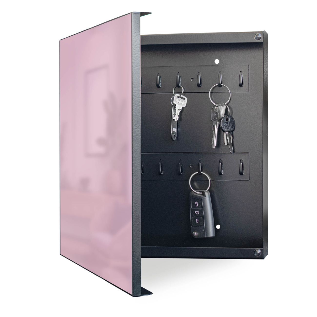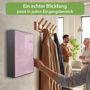 Bringe Ordnung und Eleganz in deinen Eingangsbereich mit dem banjado Schlüsselkasten Motiv Farbe Flieder. Die moderne Schlüsselbox kombiniert funktionales Design mit hochwertiger Verarbeitung und wird so zu einem echten Hingucker in Flur, Büro oder Ferienwohnung. ✅ Stilvolle Schlüsselaufbewahrung mit Motiv Farbe Flieder Der Design-Schlüsselkasten Motiv Farbe Flieder bietet Platz für bis zu 32 Schlüssel, die auf 4 stabilen Reihen mit je 8 Haken übersichtlich verstaut werden. Mit seinen kompakten Maßen von 30 x 30 x 5 cm passt die Schlüsselbox perfekt auch in kleinere Räume. Der schwarz lackierte Stahlkorpus mit links angeschlagenem Türscharnier harmoniert mit gedruckten Folie auf der Front und fügt sich nahtlos in jedes Wohnambiente ein. Ob als Schlüsselorganizer für Zuhause oder als praktische Lösung für Büros, Praxen und Gewerbe, der banjado Schlüsselkasten sorgt für Ordnung und Übersicht. Dank der magnetischen, mit Kreidestiften beschreibbaren Folie auf der Front kannst du Notizen anheften oder Termine direkt auf der Oberfläche festhalten. Die Schlüsselbox Motiv Farbe Flieder zur Wandmontage wird inklusive Befestigungsmaterial geliefert und ist schnell angebracht. So hast du deine Schlüssel jederzeit griffbereit und zugleich stilvoll verstaut. Mit diesem banjado Schlüsselkasten Motiv Farbe Flieder kombinierst du praktische Aufbewahrung mit stilvollem Wohndesign. Ob privat oder geschäftlich, die Schlüsselbox sorgt für mehr Ordnung, Übersicht und ein wohnliches Ambiente.Vorteile im Überblick