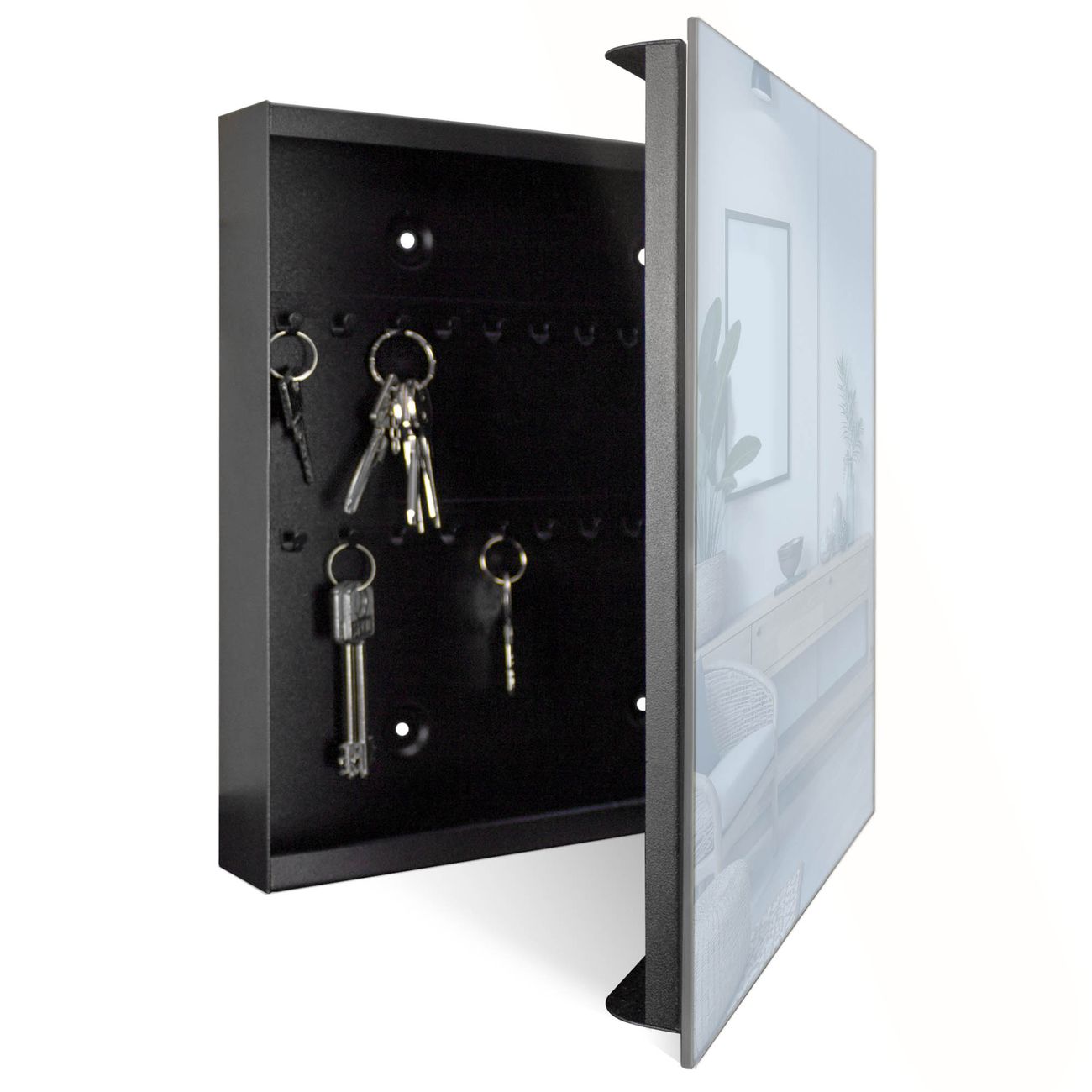 Bringe Ordnung und Eleganz in deinen Eingangsbereich mit dem banjado Schlüsselkasten Motiv Farbe Himmelblau. Die moderne Schlüsselbox kombiniert funktionales Design mit hochwertiger Verarbeitung und wird so zu einem echten Hingucker in Flur, Büro oder Ferienwohnung. ✅ Stilvolle Schlüsselaufbewahrung mit Glasfront im Motiv Farbe Himmelblau Der Design-Schlüsselkasten Motiv Farbe Himmelblau bietet Platz für bis zu 50 Schlüssel, die auf 5 stabilen Reihen mit je 10 Haken übersichtlich verstaut werden. Mit seinen kompakten Maßen von 30 x 30 x 5 cm passt die Schlüsselbox perfekt auch in kleinere Räume. Der schwarz lackierte Stahlkorpus mit rechts angeschlagenem Türscharnier harmoniert mit der Glasfront und fügt sich nahtlos in jedes Wohnambiente ein. Ob als Schlüsselorganizer für Zuhause oder als praktische Lösung für Büros, Praxen und Gewerbe, der banjado Schlüsselkasten sorgt für Ordnung und Übersicht. Dank der magnetischen, mit Kreidestiften beschreibbaren Glasfront kannst du Notizen anheften oder Termine direkt auf der Oberfläche festhalten. Die Schlüsselbox Motiv Farbe Himmelblau zur Wandmontage wird inklusive Befestigungsmaterial geliefert und ist schnell angebracht. So hast du deine Schlüssel jederzeit griffbereit und zugleich stilvoll verstaut. Mit diesem banjado Schlüsselkasten Motiv Farbe Himmelblau kombinierst du praktische Aufbewahrung mit stilvollem Wohndesign. Ob privat oder geschäftlich, die Schlüsselbox sorgt für mehr Ordnung, Übersicht und ein wohnliches Ambiente.Vorteile im Überblick