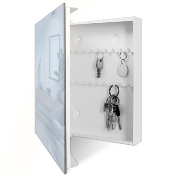 Bringe Ordnung und Eleganz in deinen Eingangsbereich mit dem banjado Schlüsselkasten Motiv Farbe Himmelblau. Die moderne Schlüsselbox kombiniert funktionales Design mit hochwertiger Verarbeitung und wird so zu einem echten Hingucker in Flur, Büro oder Ferienwohnung. ✅ Stilvolle Schlüsselaufbewahrung mit Glasfront im Motiv Farbe Himmelblau Der Design-Schlüsselkasten Motiv Farbe Himmelblau bietet Platz für bis zu 50 Schlüssel, die auf 5 stabilen Reihen mit je 10 Haken übersichtlich verstaut werden. Mit seinen kompakten Maßen von 30 x 30 x 5 cm passt die Schlüsselbox perfekt auch in kleinere Räume. Der weiß lackierte Stahlkorpus mit rechts angeschlagenem Türscharnier harmoniert mit der Glasfront und fügt sich nahtlos in jedes Wohnambiente ein. Ob als Schlüsselorganizer für Zuhause oder als praktische Lösung für Büros, Praxen und Gewerbe, der banjado Schlüsselkasten sorgt für Ordnung und Übersicht. Dank der magnetischen, mit Kreidestiften beschreibbaren Glasfront kannst du Notizen anheften oder Termine direkt auf der Oberfläche festhalten. Die Schlüsselbox Motiv Farbe Himmelblau zur Wandmontage wird inklusive Befestigungsmaterial geliefert und ist schnell angebracht. So hast du deine Schlüssel jederzeit griffbereit und zugleich stilvoll verstaut. Mit diesem banjado Schlüsselkasten Motiv Farbe Himmelblau kombinierst du praktische Aufbewahrung mit stilvollem Wohndesign. Ob privat oder geschäftlich, die Schlüsselbox sorgt für mehr Ordnung, Übersicht und ein wohnliches Ambiente.Vorteile im Überblick