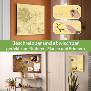 Bringe Ordnung und Eleganz in deinen Eingangsbereich mit dem banjado Schlüsselkasten Motiv Farbe Honig. Die moderne Schlüsselbox kombiniert funktionales Design mit hochwertiger Verarbeitung und wird so zu einem echten Hingucker in Flur, Büro oder Ferienwohnung. ✅ Stilvolle Schlüsselaufbewahrung mit Glasfront im Motiv Farbe Honig Der Design-Schlüsselkasten Motiv Farbe Honig bietet Platz für bis zu 50 Schlüssel, die auf 5 stabilen Reihen mit je 10 Haken übersichtlich verstaut werden. Mit seinen kompakten Maßen von 30 x 30 x 5 cm passt die Schlüsselbox perfekt auch in kleinere Räume. Der schwarz lackierte Stahlkorpus mit rechts angeschlagenem Türscharnier harmoniert mit der Glasfront und fügt sich nahtlos in jedes Wohnambiente ein. Ob als Schlüsselorganizer für Zuhause oder als praktische Lösung für Büros, Praxen und Gewerbe, der banjado Schlüsselkasten sorgt für Ordnung und Übersicht. Dank der magnetischen, mit Kreidestiften beschreibbaren Glasfront kannst du Notizen anheften oder Termine direkt auf der Oberfläche festhalten. Die Schlüsselbox Motiv Farbe Honig zur Wandmontage wird inklusive Befestigungsmaterial geliefert und ist schnell angebracht. So hast du deine Schlüssel jederzeit griffbereit und zugleich stilvoll verstaut. Mit diesem banjado Schlüsselkasten Motiv Farbe Honig kombinierst du praktische Aufbewahrung mit stilvollem Wohndesign. Ob privat oder geschäftlich, die Schlüsselbox sorgt für mehr Ordnung, Übersicht und ein wohnliches Ambiente.Vorteile im Überblick