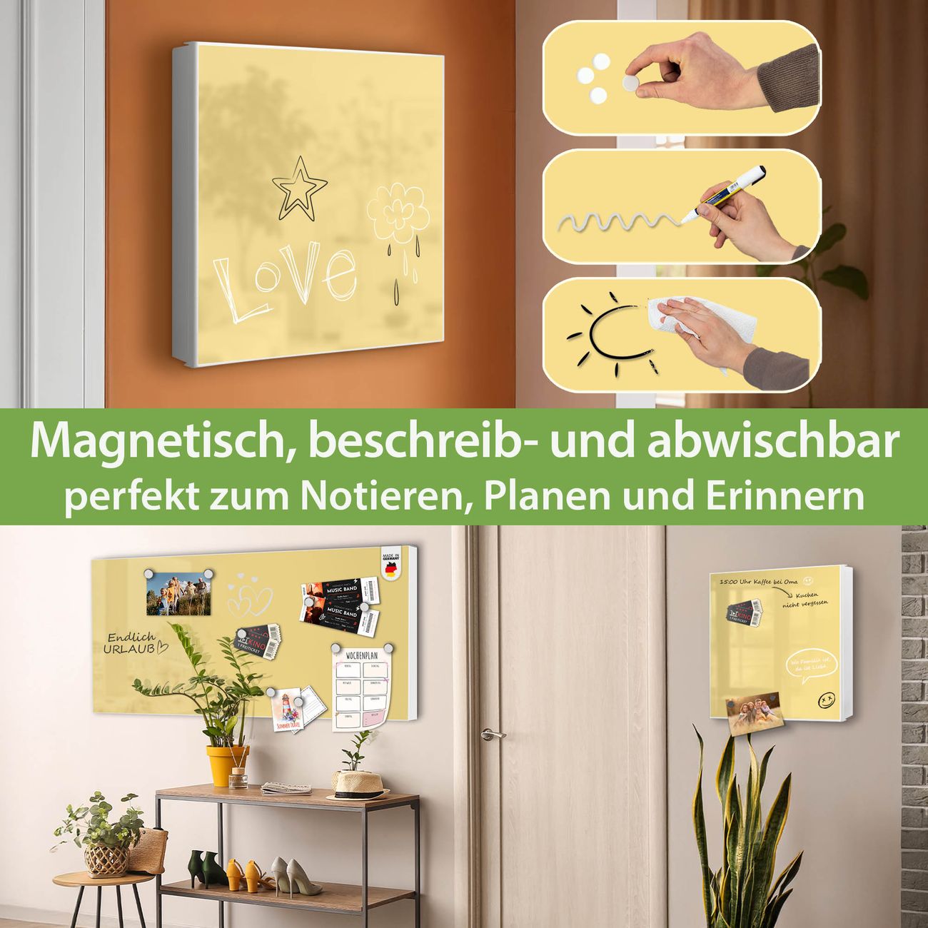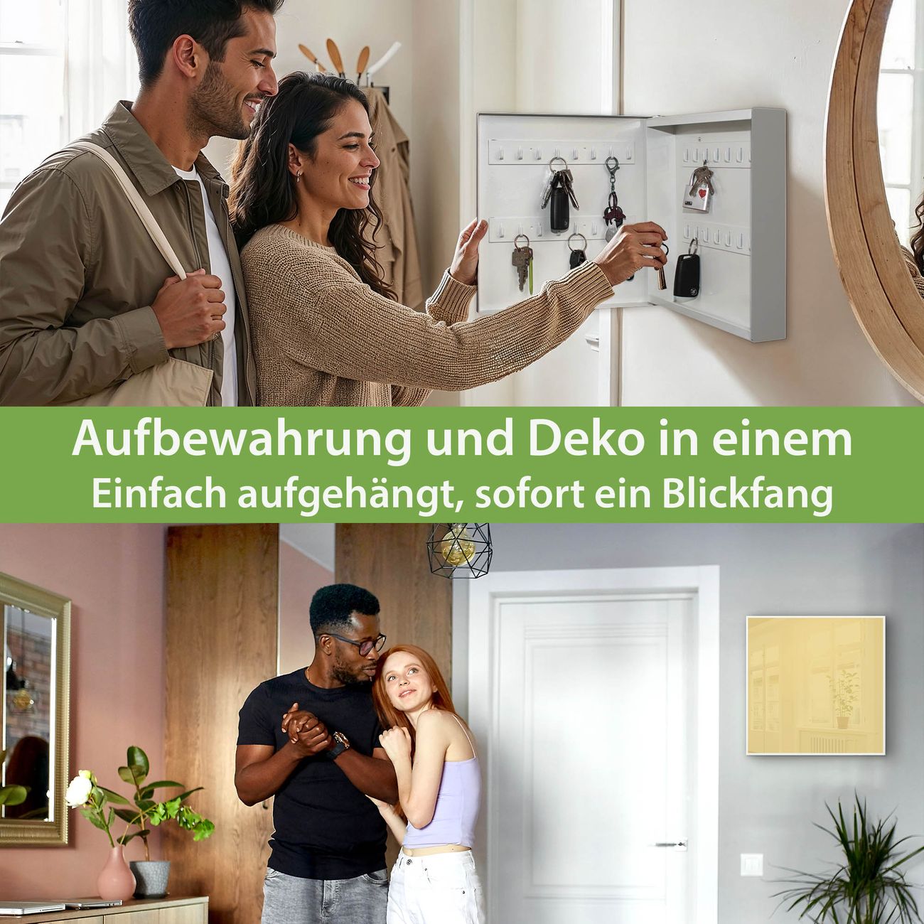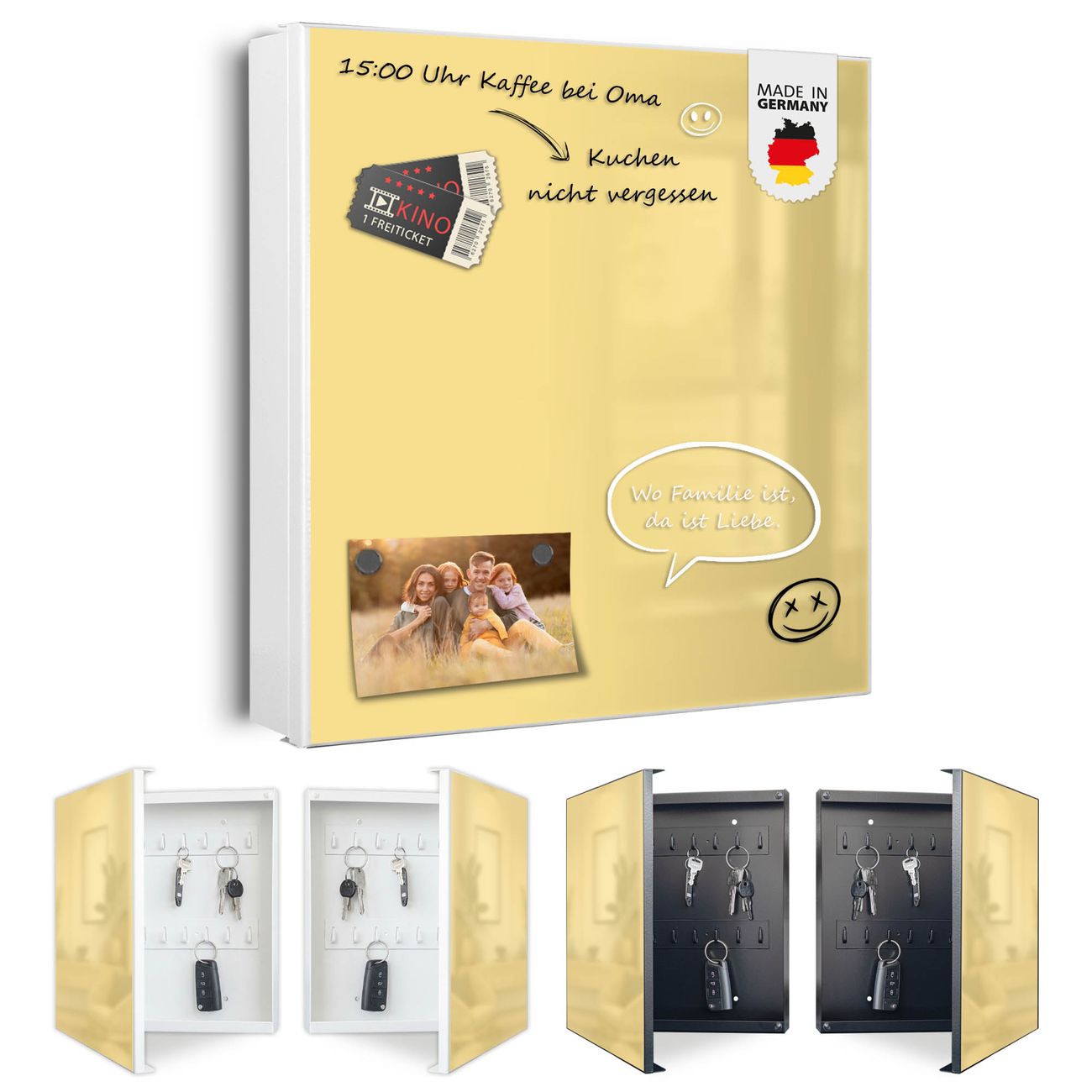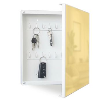 Bringe Ordnung und Eleganz in deinen Eingangsbereich mit dem banjado Schlüsselkasten Motiv Farbe Honig. Die moderne Schlüsselbox kombiniert funktionales Design mit hochwertiger Verarbeitung und wird so zu einem echten Hingucker in Flur, Büro oder Ferienwohnung. ✅ Stilvolle Schlüsselaufbewahrung mit Motiv Farbe Honig Der Design-Schlüsselkasten Motiv Farbe Honig bietet Platz für bis zu 32 Schlüssel, die auf 4 stabilen Reihen mit je 8 Haken übersichtlich verstaut werden. Mit seinen kompakten Maßen von 30 x 30 x 5 cm passt die Schlüsselbox perfekt auch in kleinere Räume. Der weiß lackierte Stahlkorpus mit rechts angeschlagenem Türscharnier harmoniert mit gedruckten Folie auf der Front und fügt sich nahtlos in jedes Wohnambiente ein. Ob als Schlüsselorganizer für Zuhause oder als praktische Lösung für Büros, Praxen und Gewerbe, der banjado Schlüsselkasten sorgt für Ordnung und Übersicht. Dank der magnetischen, mit Kreidestiften beschreibbaren Folie auf der Front kannst du Notizen anheften oder Termine direkt auf der Oberfläche festhalten. Die Schlüsselbox Motiv Farbe Honig zur Wandmontage wird inklusive Befestigungsmaterial geliefert und ist schnell angebracht. So hast du deine Schlüssel jederzeit griffbereit und zugleich stilvoll verstaut. Mit diesem banjado Schlüsselkasten Motiv Farbe Honig kombinierst du praktische Aufbewahrung mit stilvollem Wohndesign. Ob privat oder geschäftlich, die Schlüsselbox sorgt für mehr Ordnung, Übersicht und ein wohnliches Ambiente.Vorteile im Überblick
